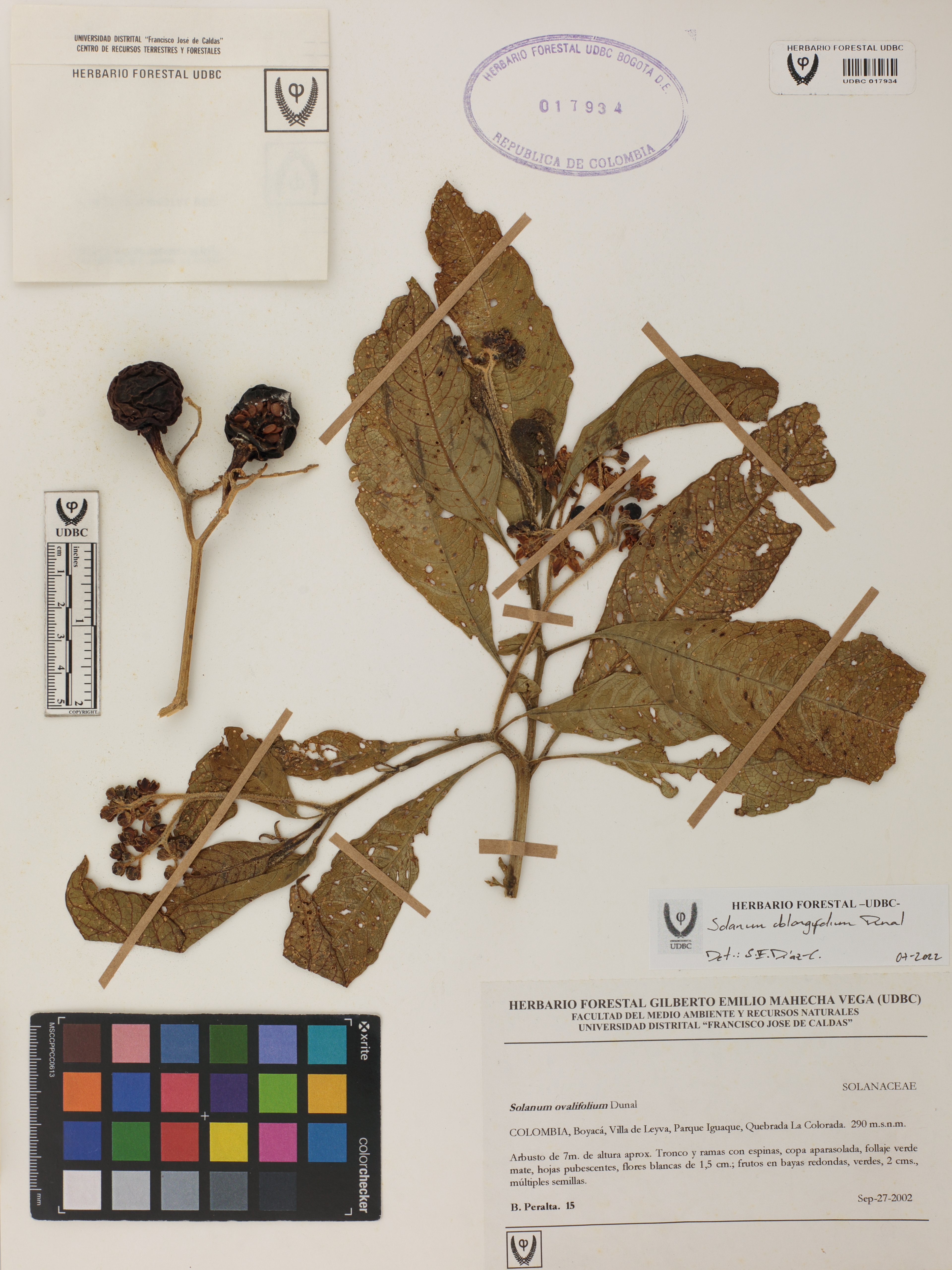 Fotografía del ejemplar Peralta, B. 15, determinado como Solanum oblongifolium en el año 2022