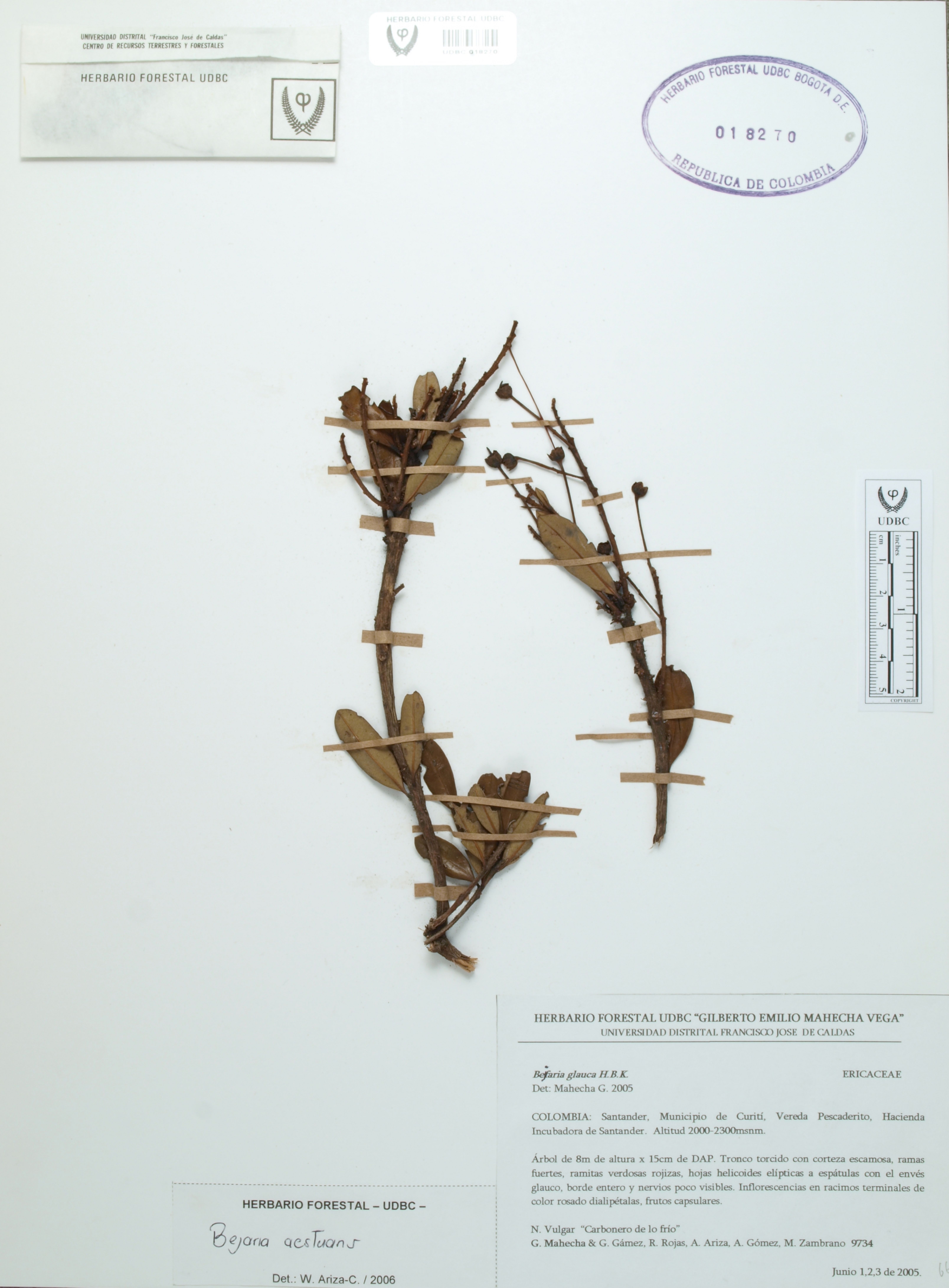 Fotografía del ejemplar Mahecha, G. 9734, determinado como Bejaria aestuans en el año 2006