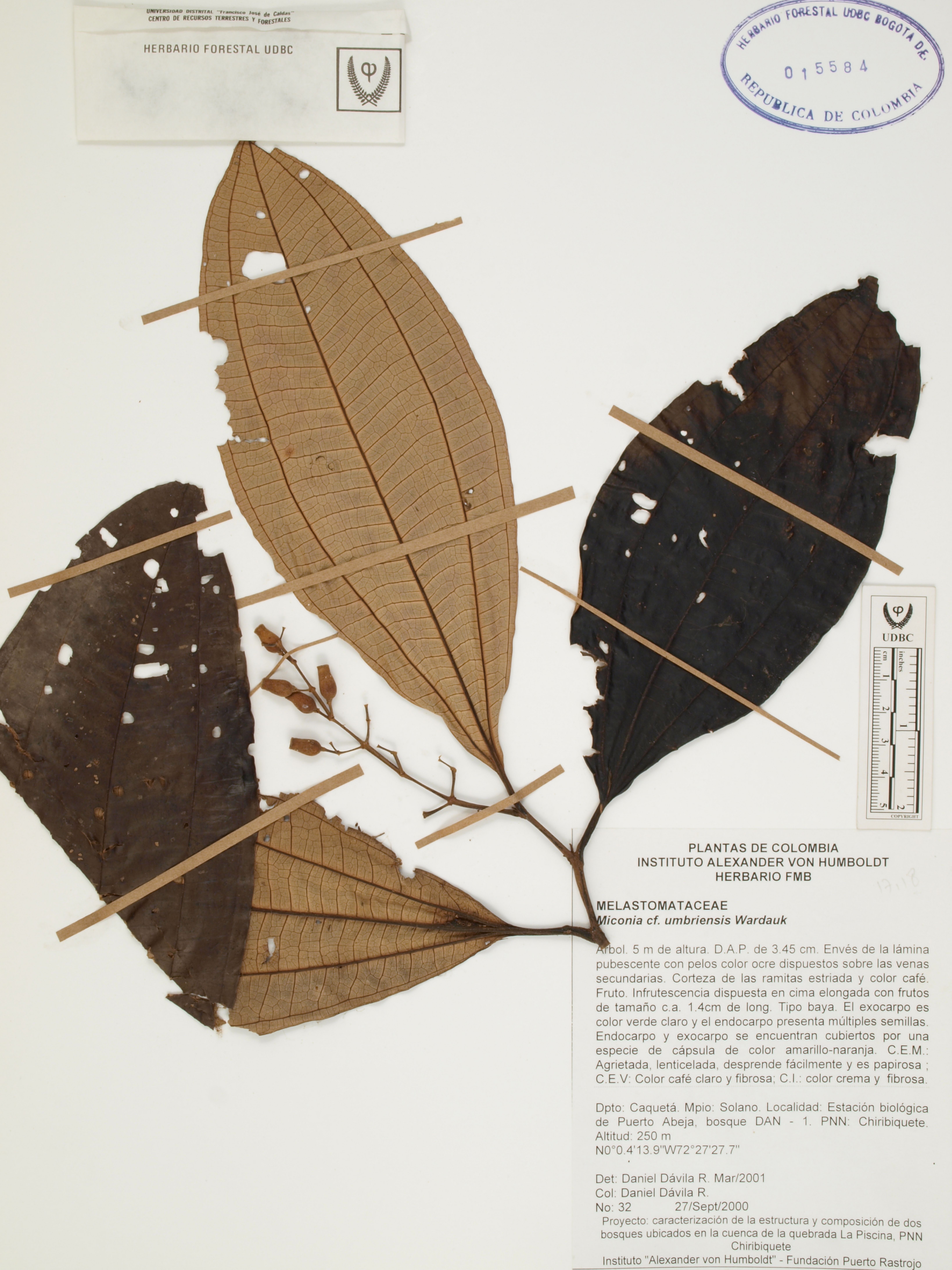 Fotografía del ejemplar Dávila, D. 32, determinado como Miconia umbriensis en el año 2001