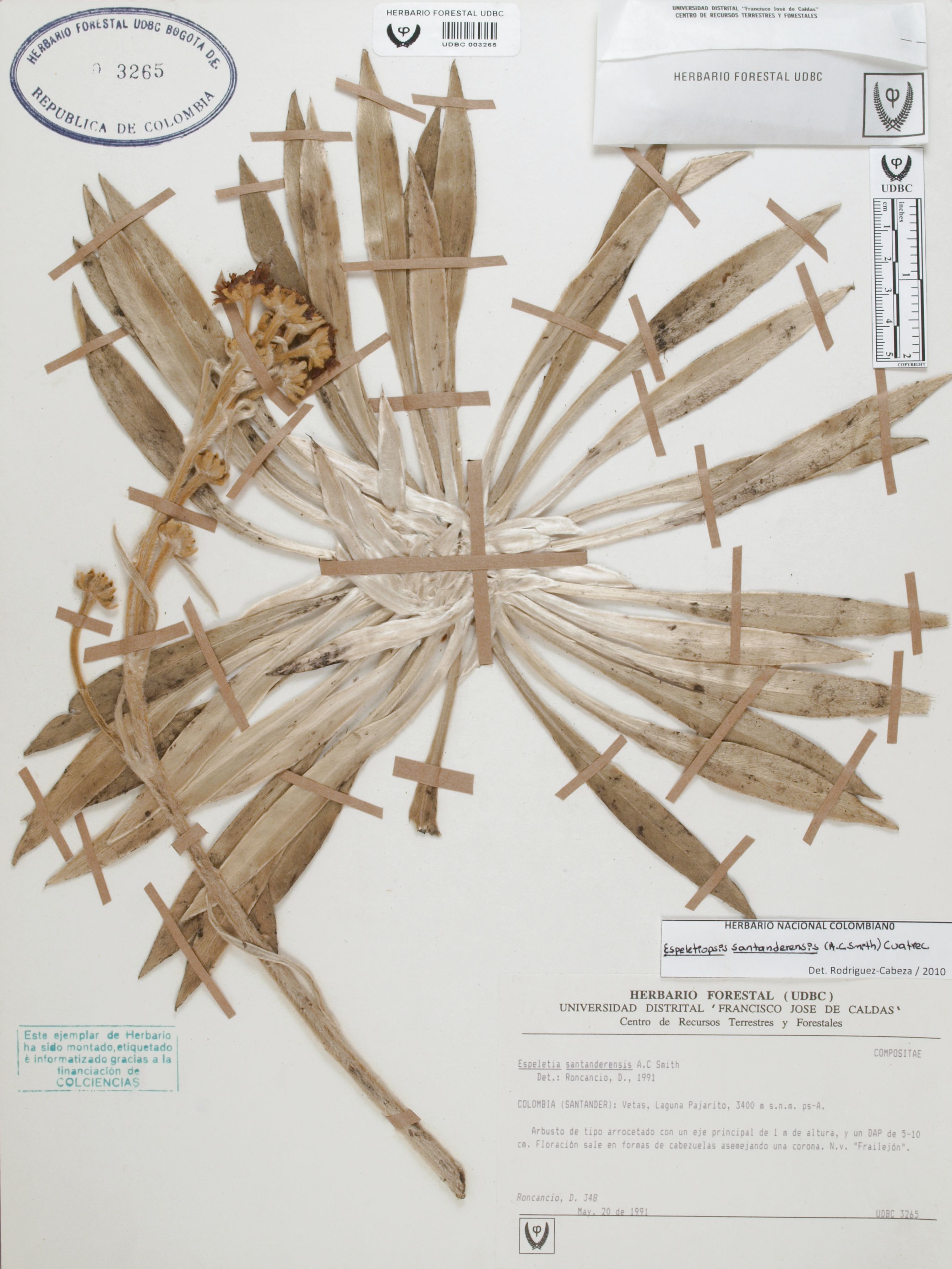 Fotografía del ejemplar Roncancio, D. 348, determinado como Espeletiopsis santanderensis en el año 2010