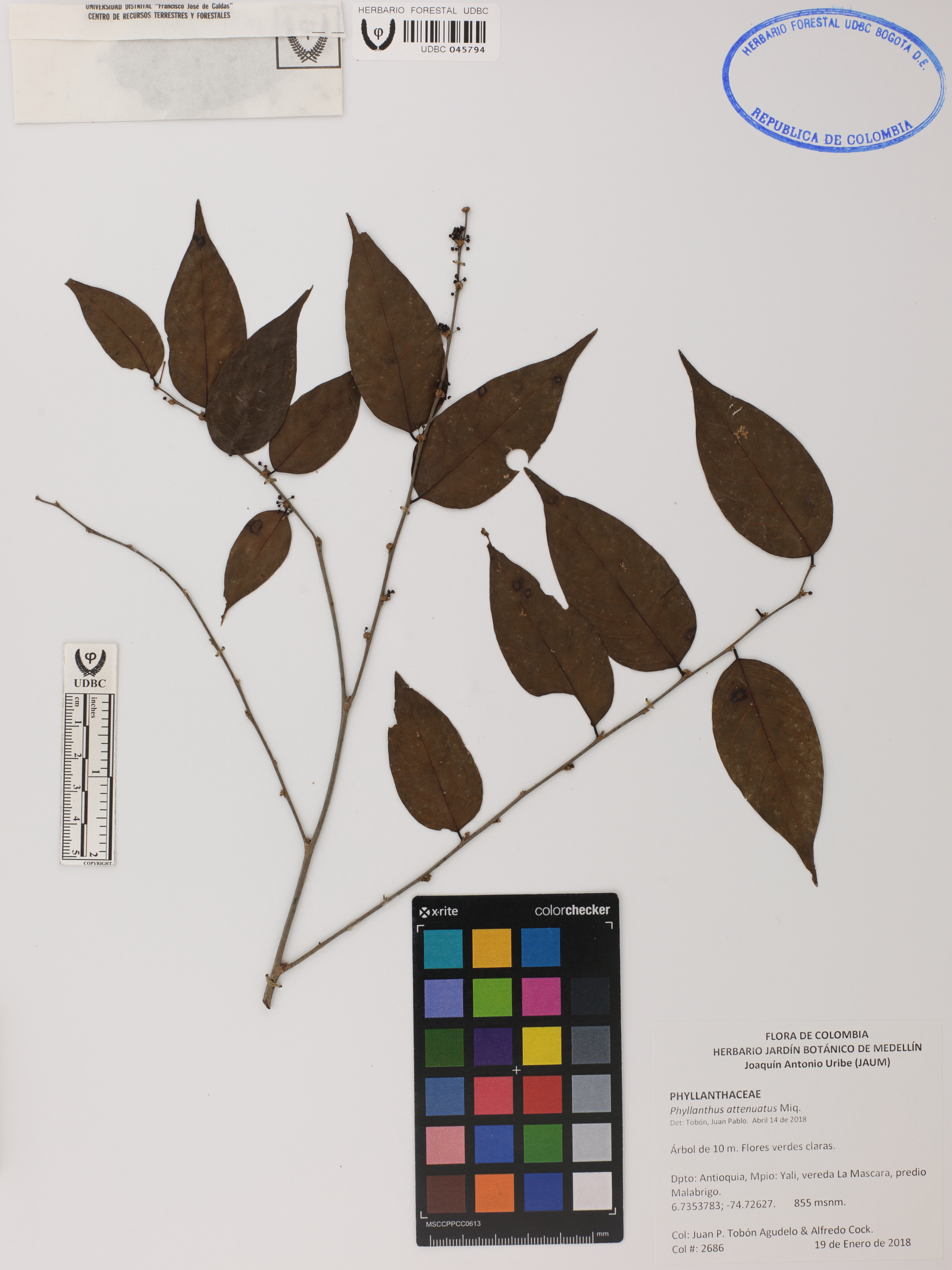 Fotografía del ejemplar Tobón-Agudelo, J. 2686, determinado como Phyllanthus attenuatus en el año 2018