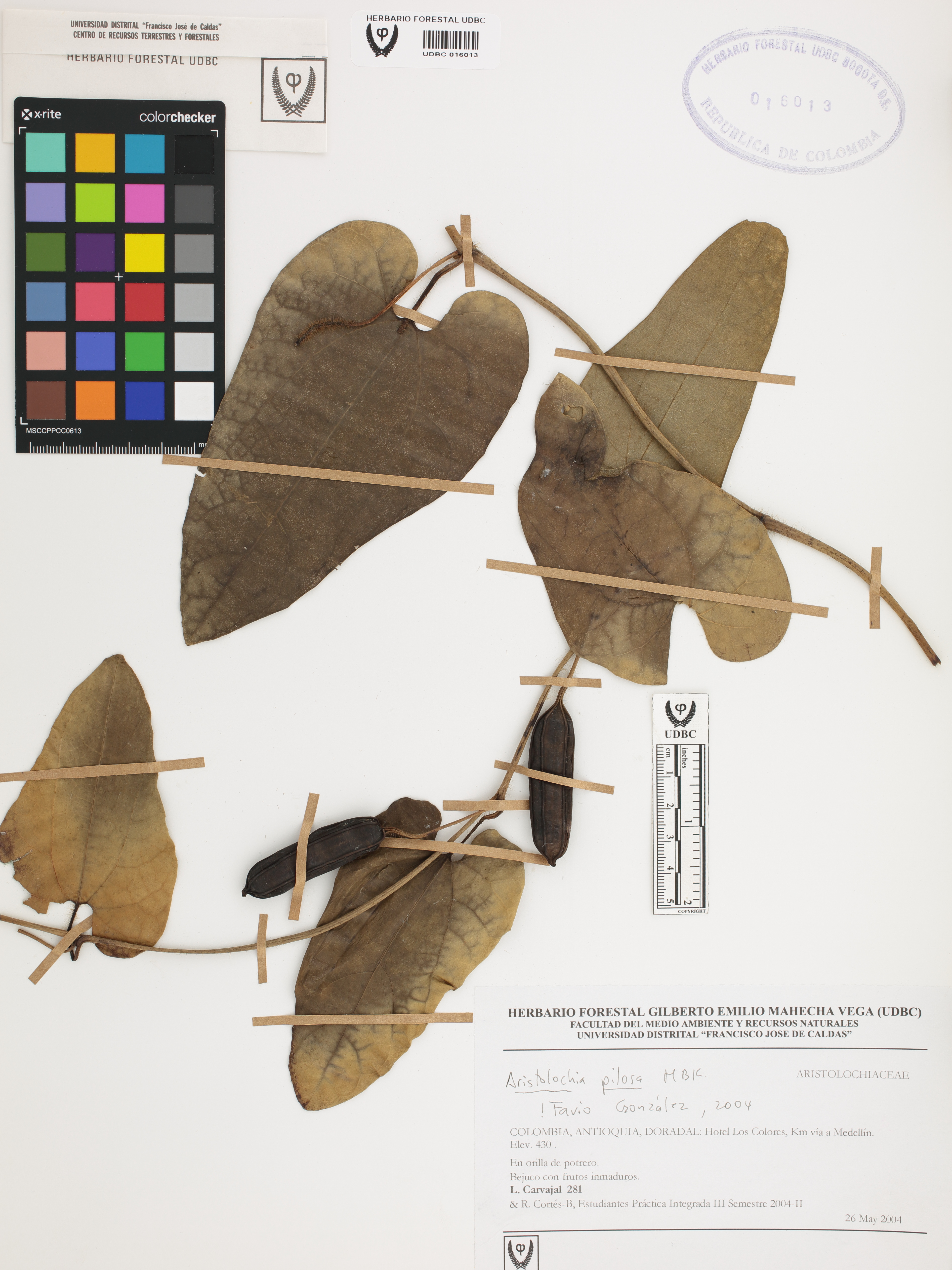 Fotografía del ejemplar Carvajal, L. 281, determinado como Aristolochia pilosa en el año 2004
