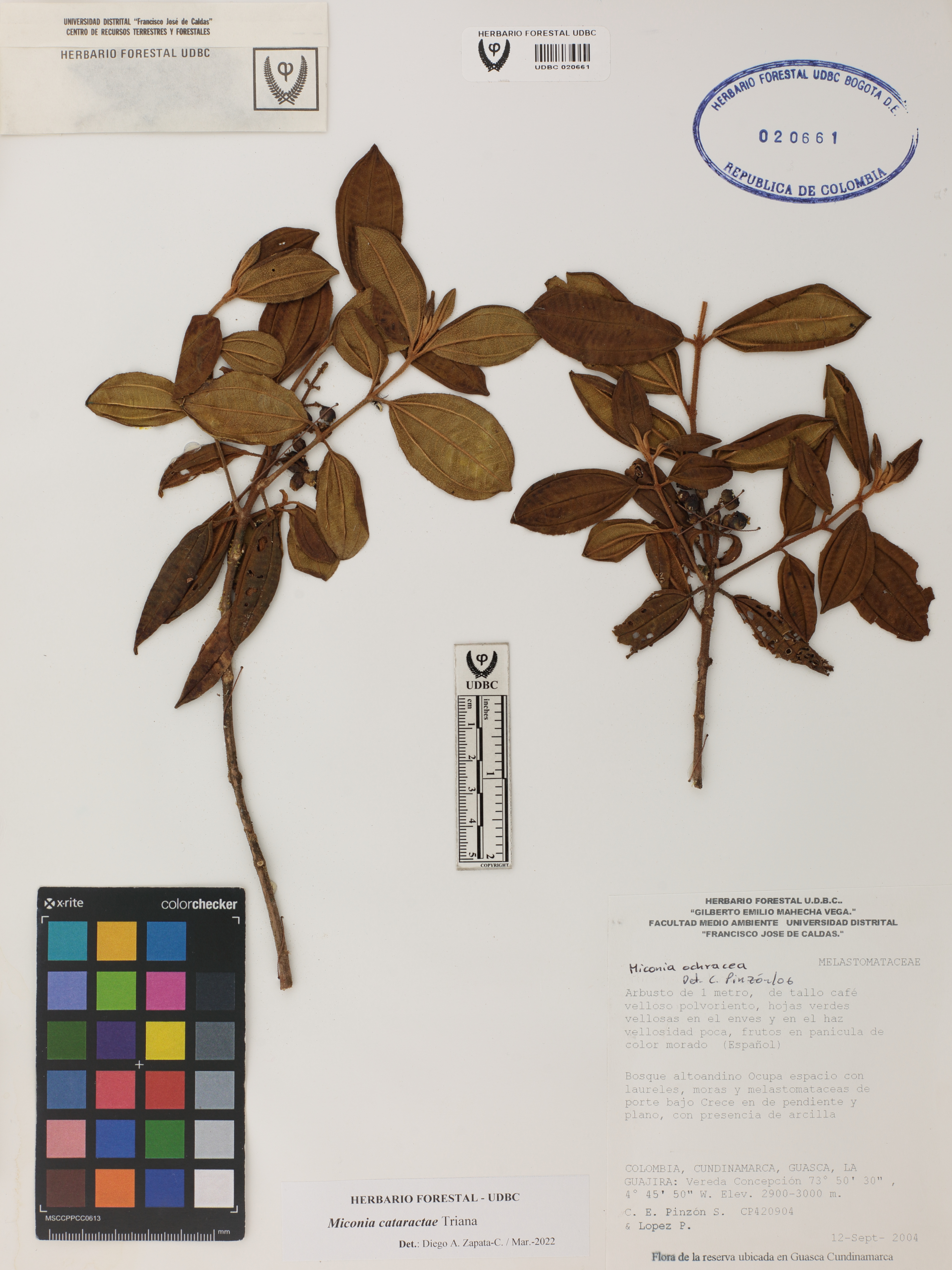 Fotografía del ejemplar Pinzón, C. 42, determinado como Miconia cataractae en el año 2022