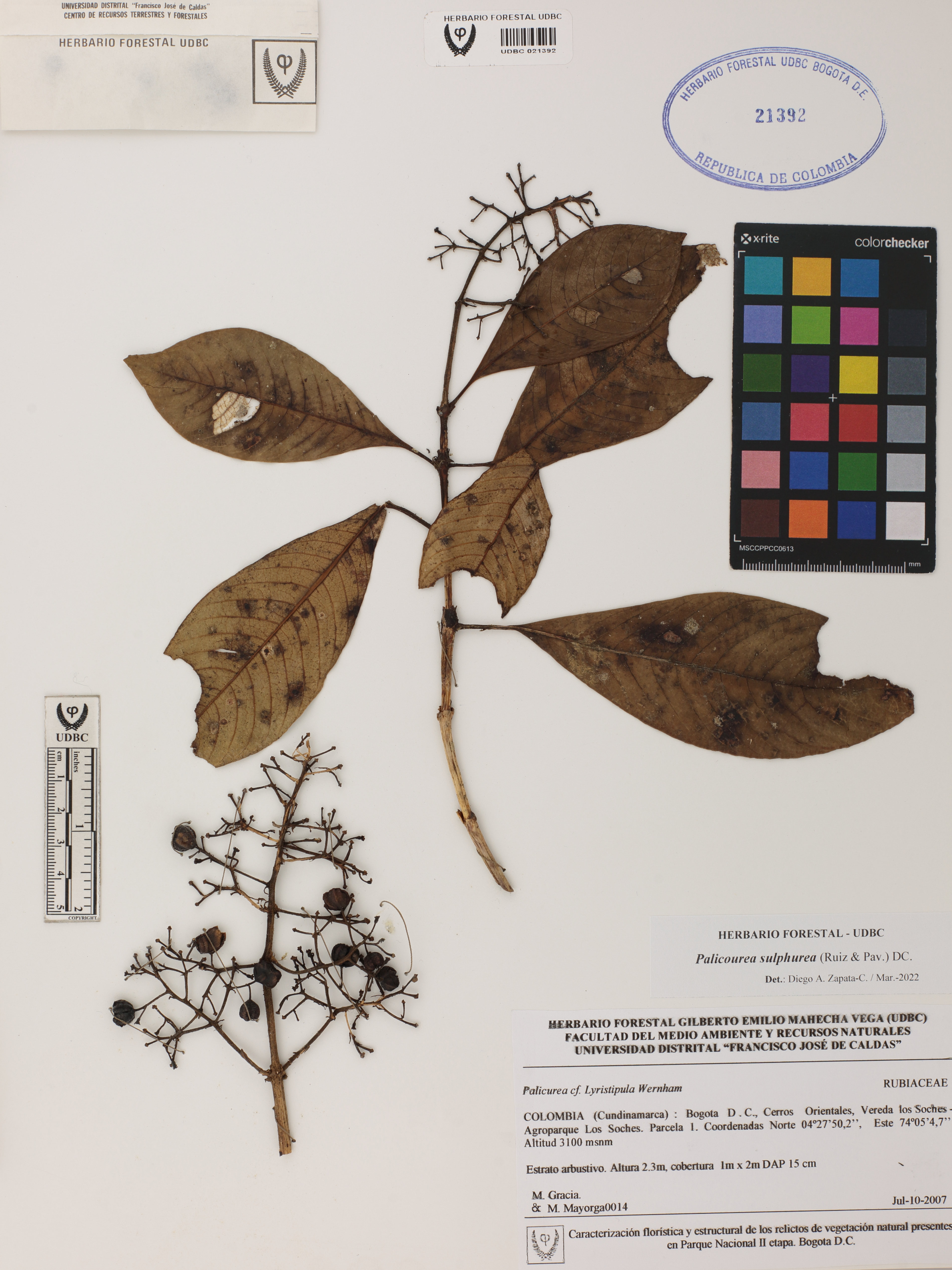 Fotografía del ejemplar Gracia, M. 14, determinado como Palicourea sulphurea en el año 2022