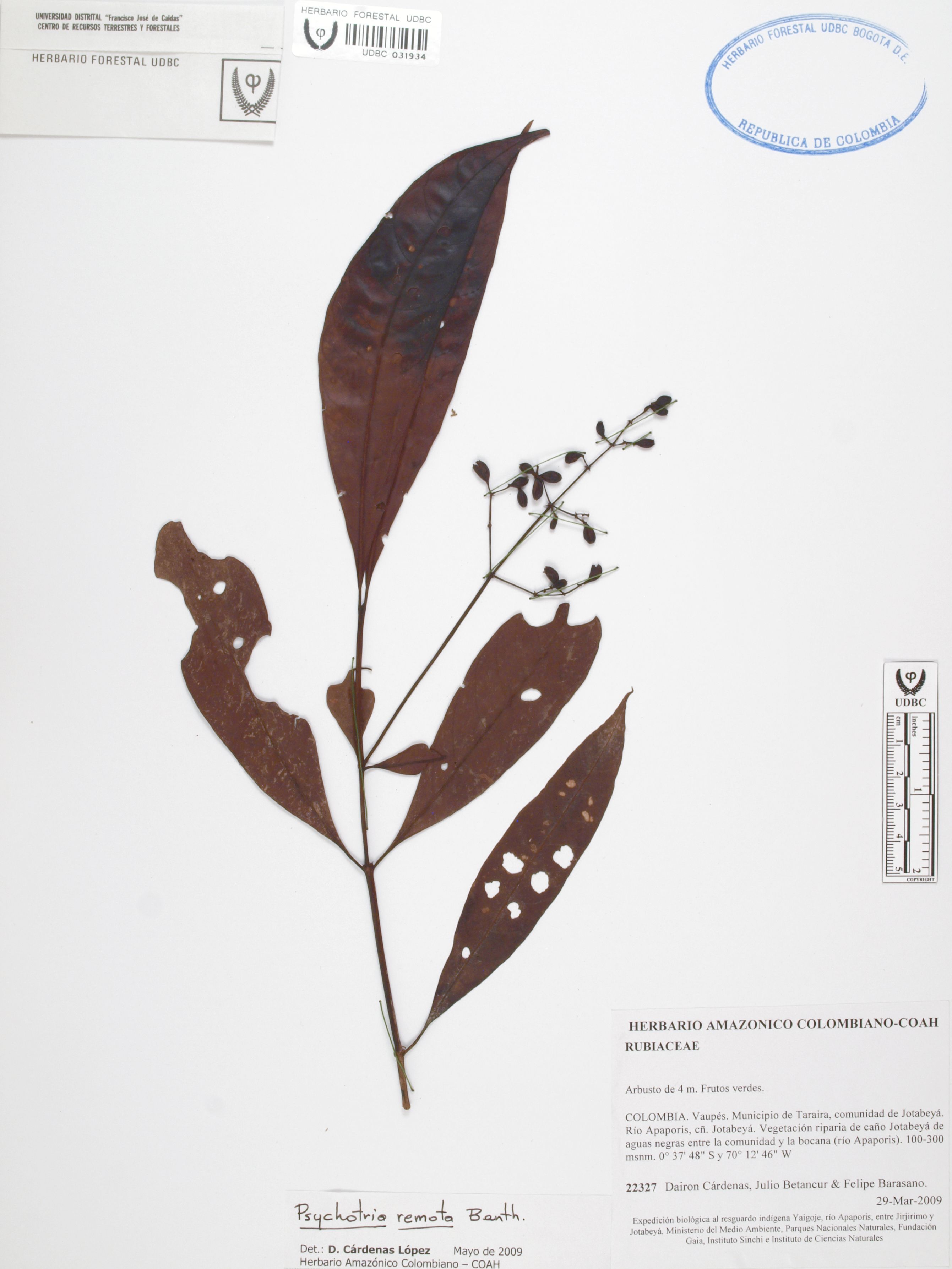 Fotografía del ejemplar Cárdenas, D. 22327, determinado como Psychotria remota en el año 2009