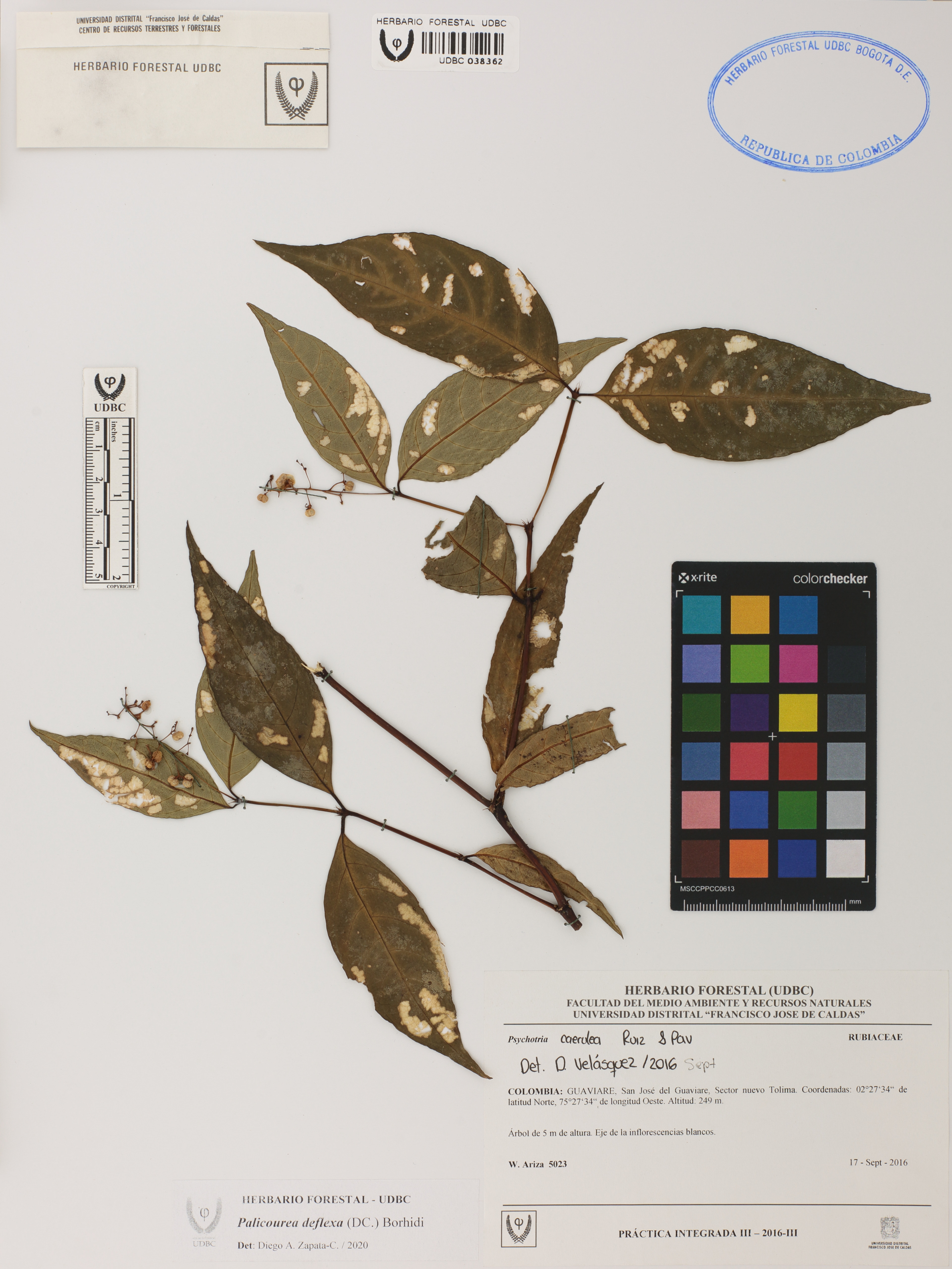 Fotografía del ejemplar Ariza, W. 5023, determinado como Palicourea deflexa en el año 2020