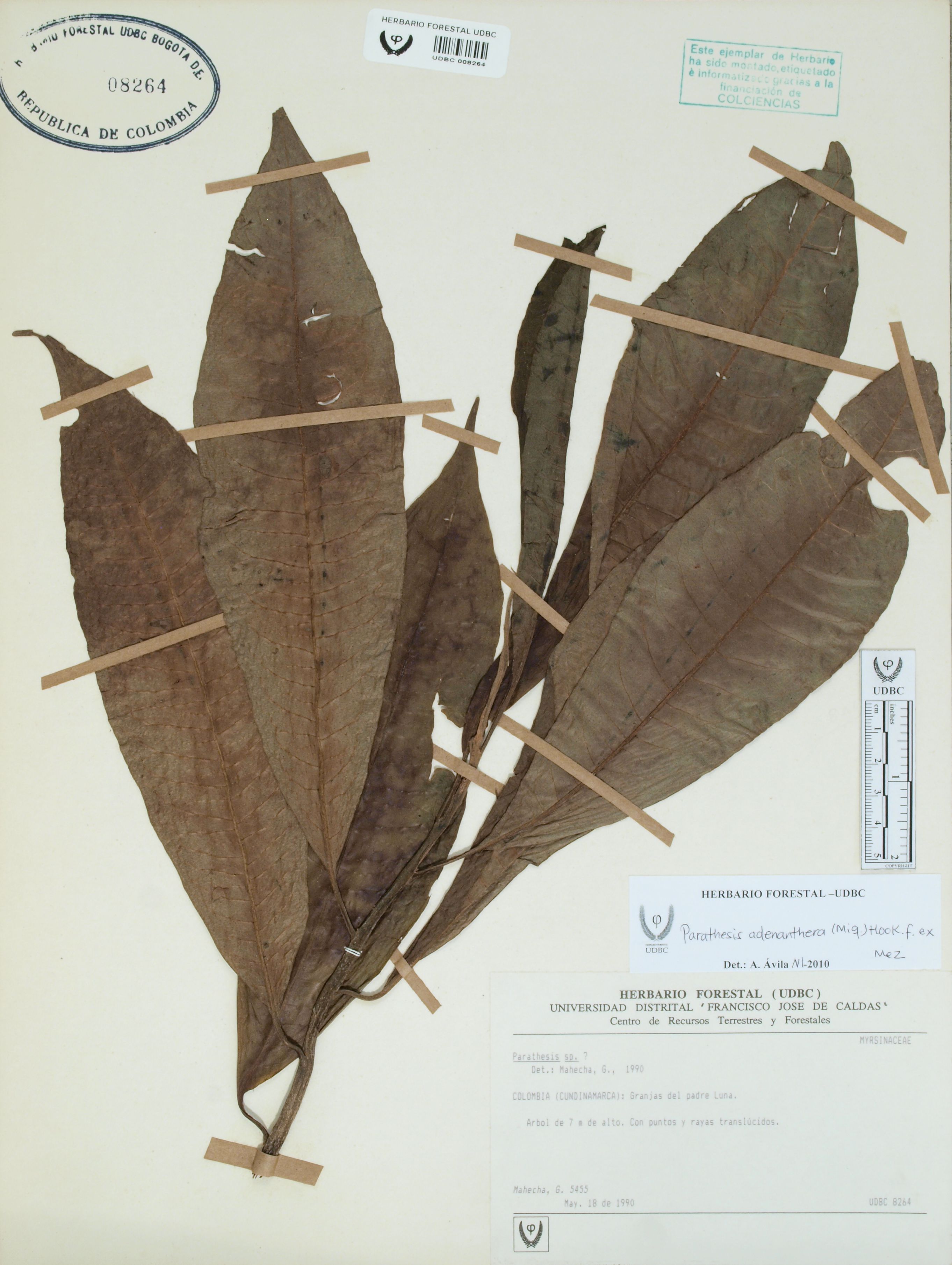 Fotografía del ejemplar Mahecha, G. 5455, determinado como Parathesis adenanthera en el año 2010