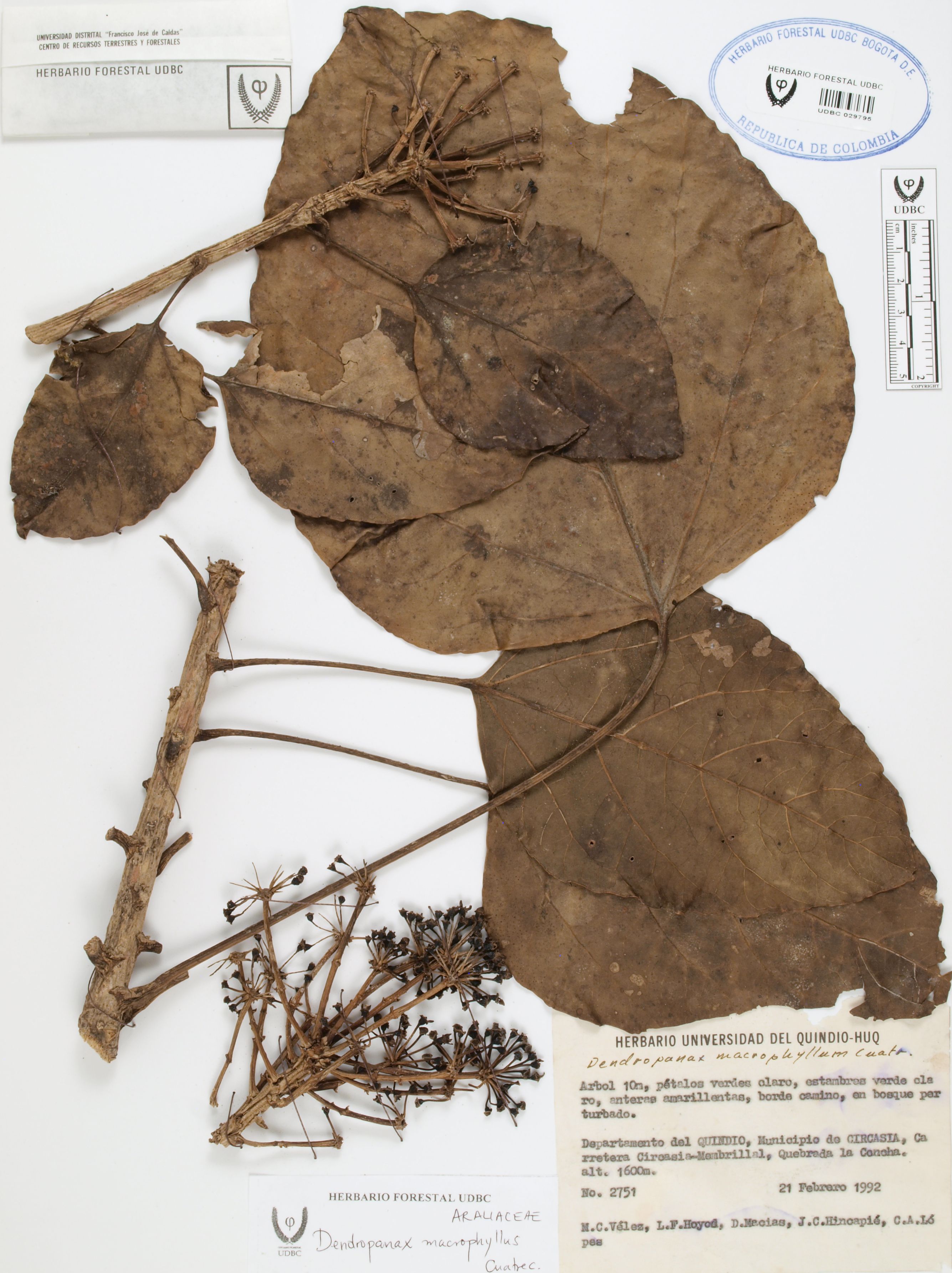 Fotografía del ejemplar Vélez, M. 2751, determinado como Dendropanax macrophyllus
