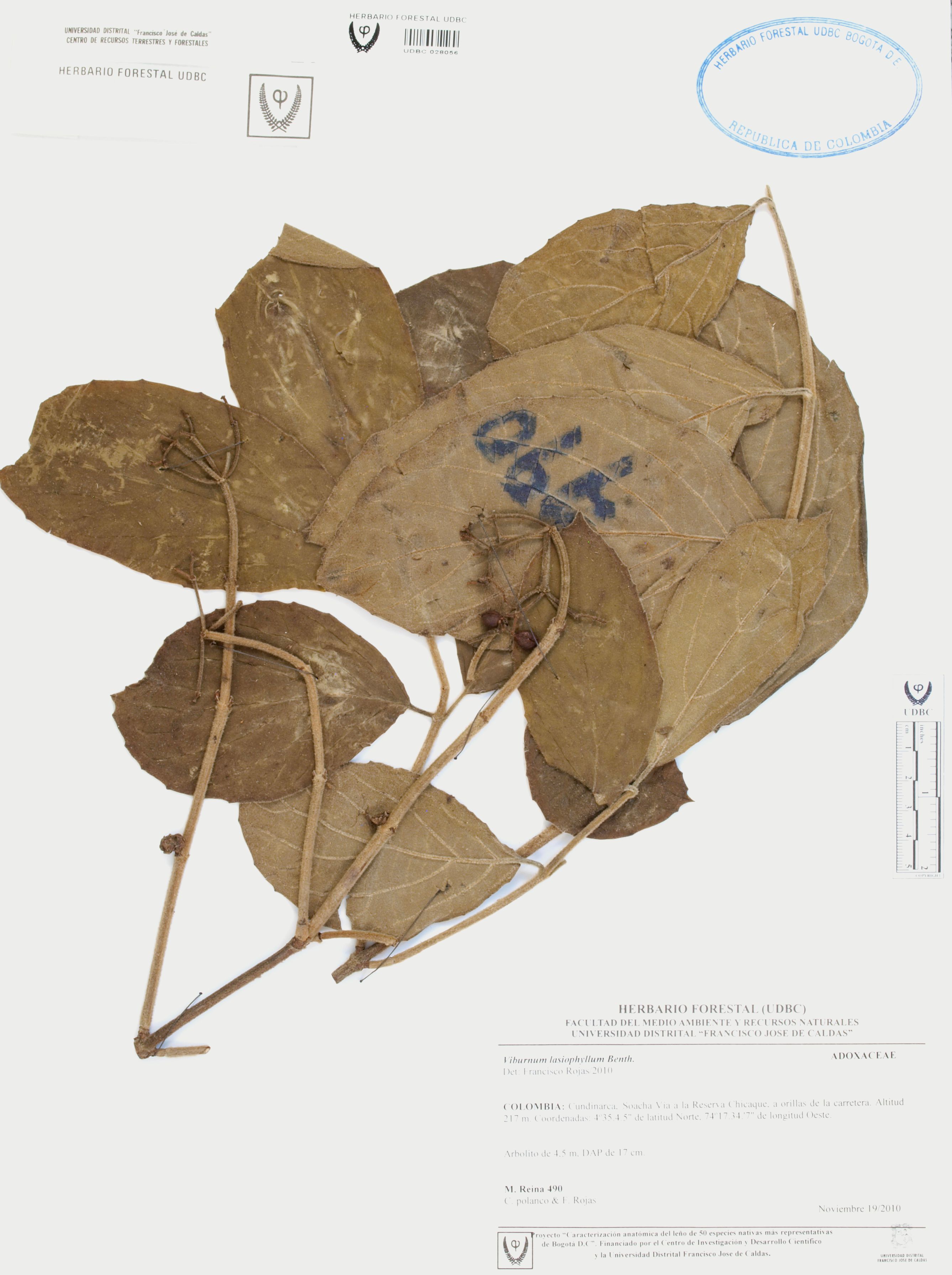 Fotografía del ejemplar Reina, M. 490, determinado como Viburnum lasiophyllum en el año 2010