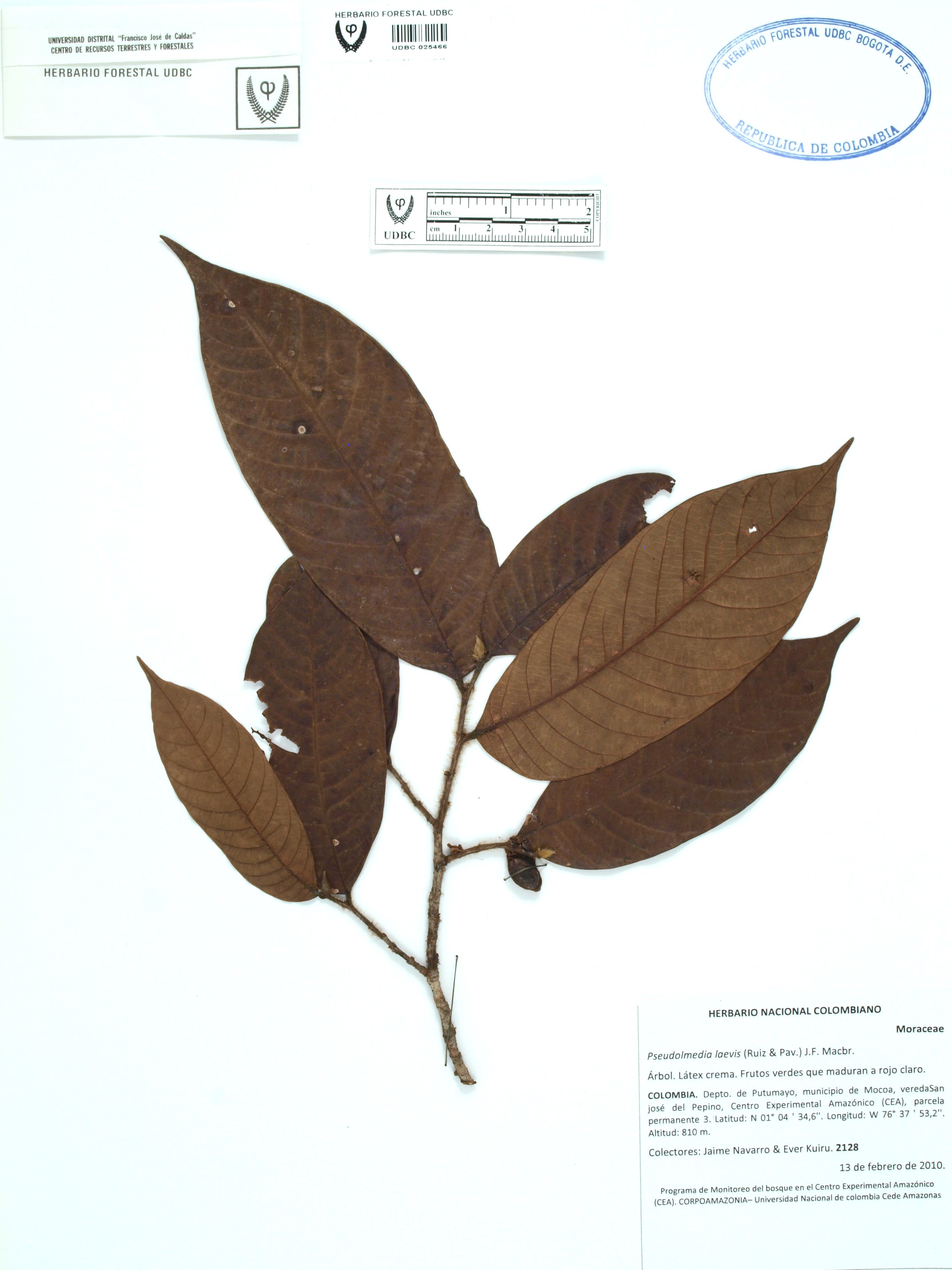 Fotografía del ejemplar Navarro, J. 2128, determinado como Pseudolmedia laevis