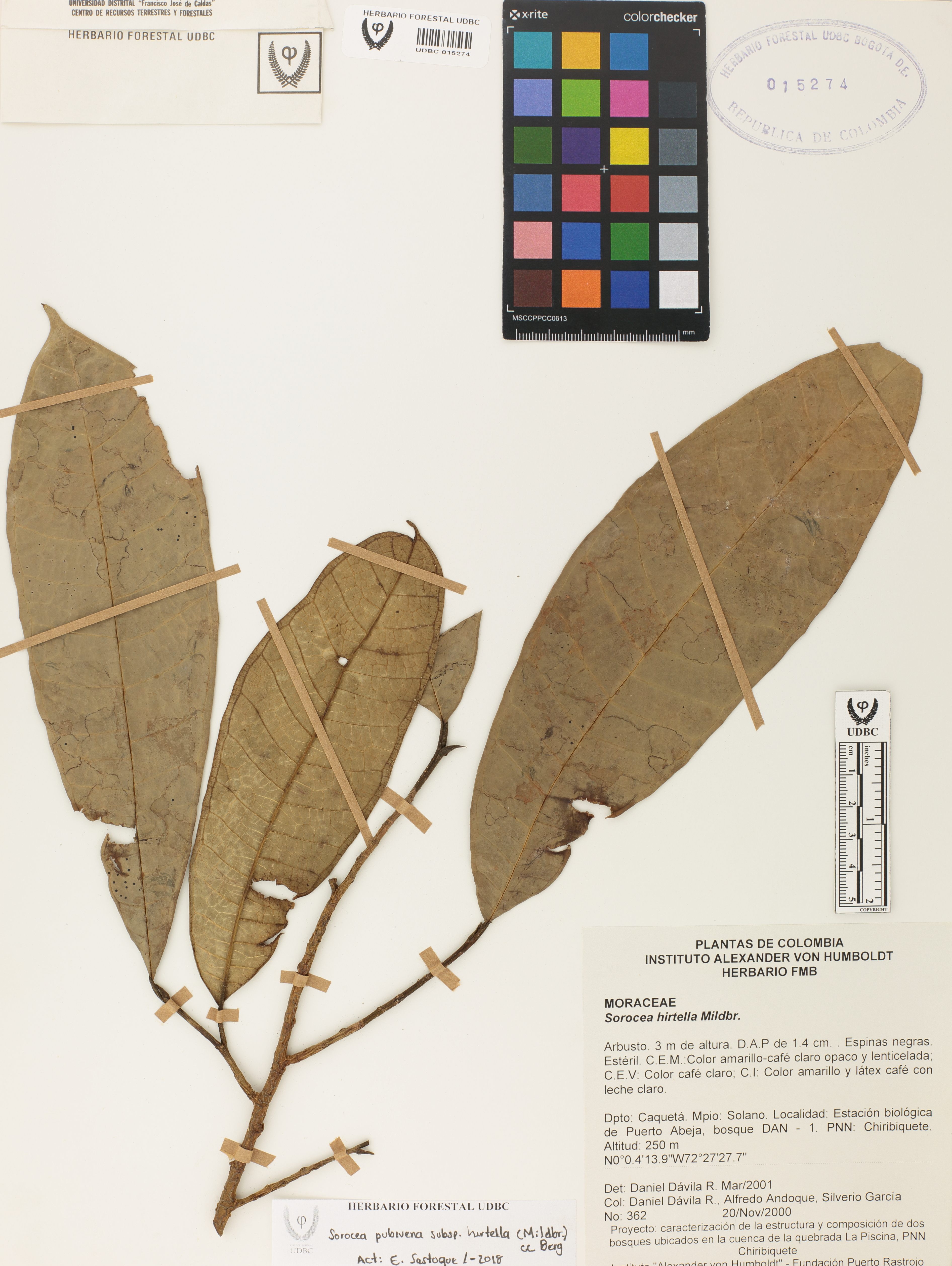 Fotografía del ejemplar Dávila, D. 362, determinado como Sorocea pubivena subsp. hirtella en el año 2018