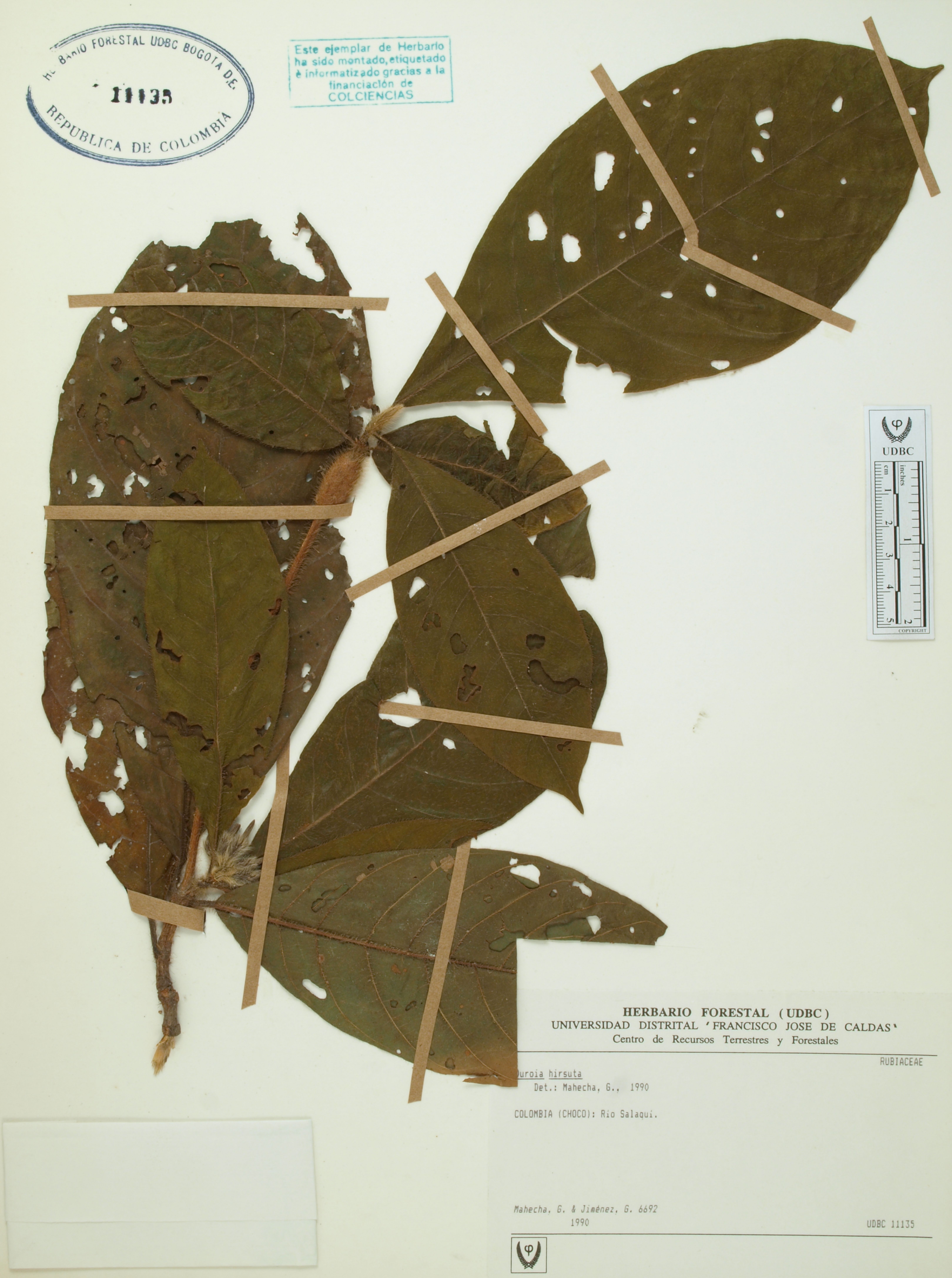 Fotografía del ejemplar Mahecha, G. 6692, determinado como Duroia hirsuta en el año 1990