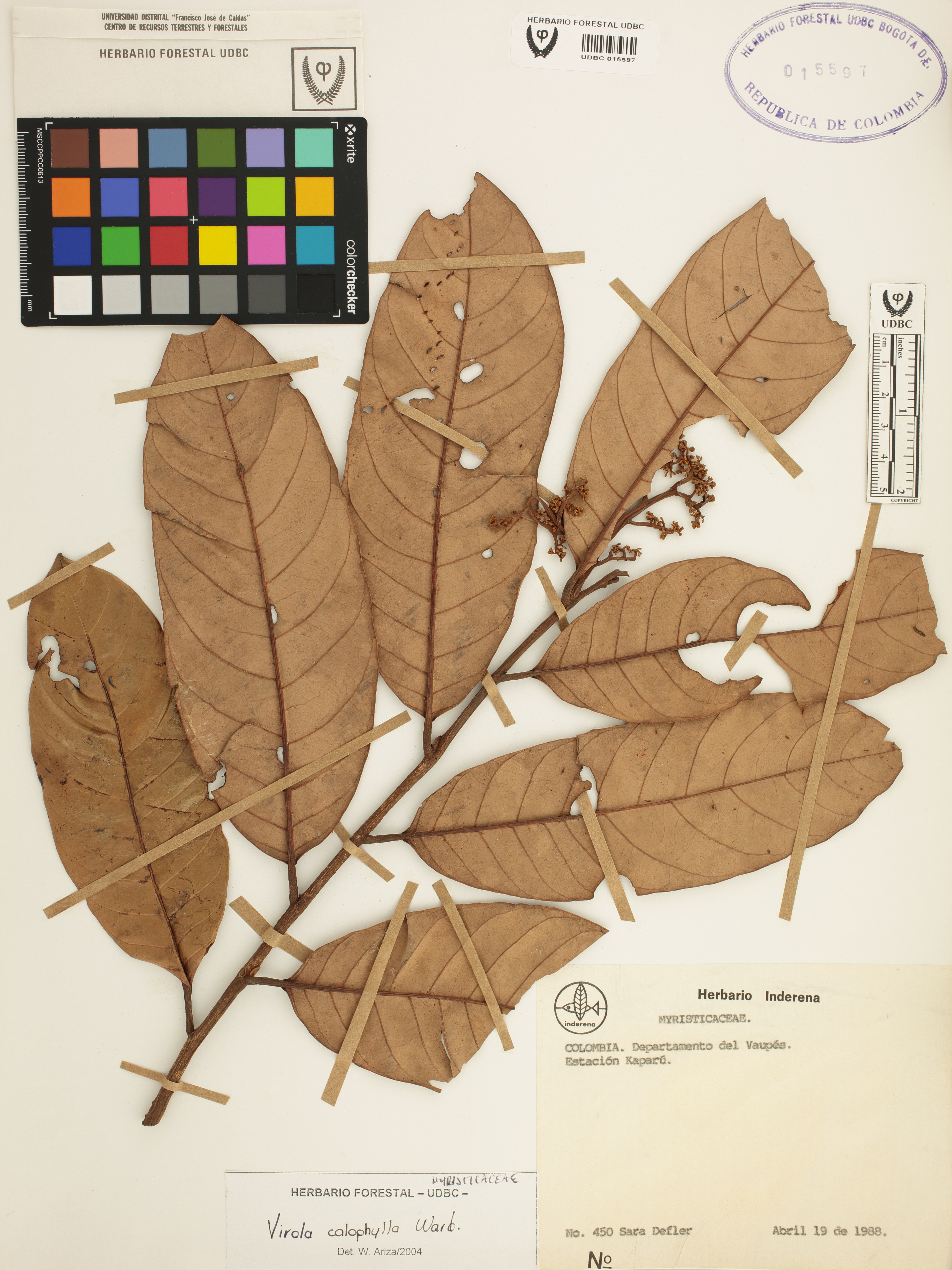 Fotografía del ejemplar Defler, S. 450, determinado como Virola calophylla en el año 2004