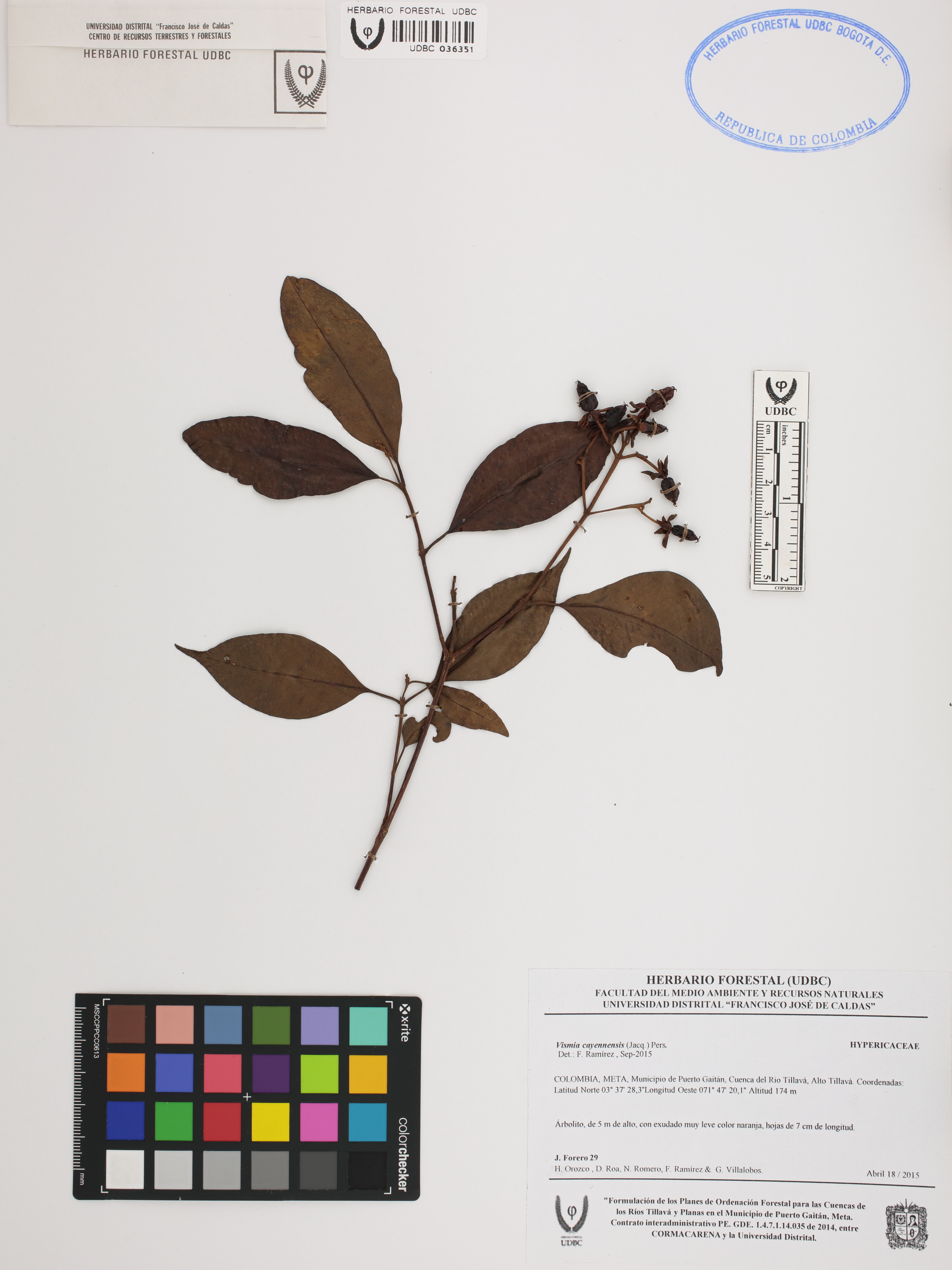 Fotografía del ejemplar Forero, J. 29, determinado como Vismia cayennensis en el año 2015