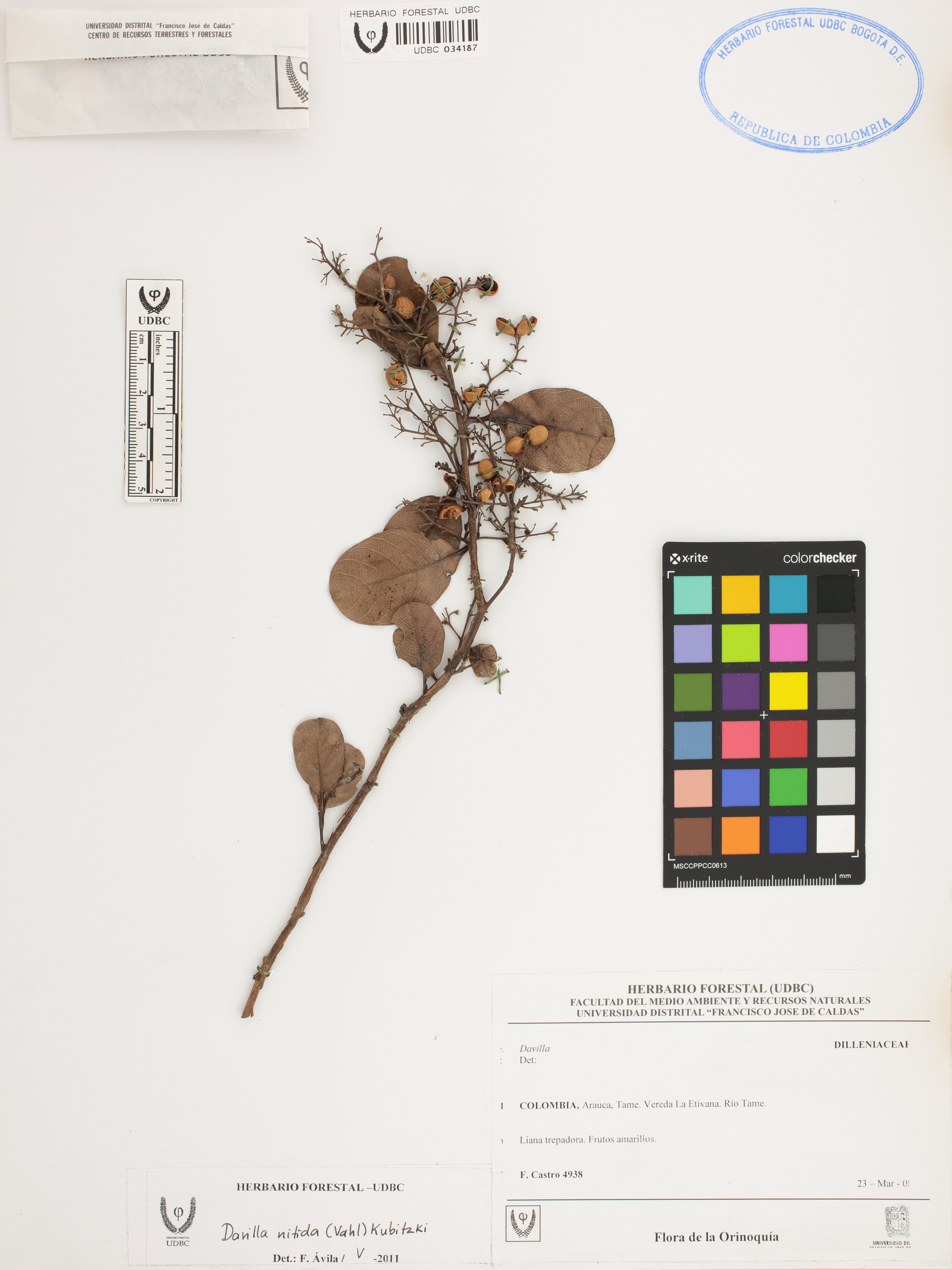 Fotografía del ejemplar Castro, F. 4938, determinado como Davilla nitida en el año 2011