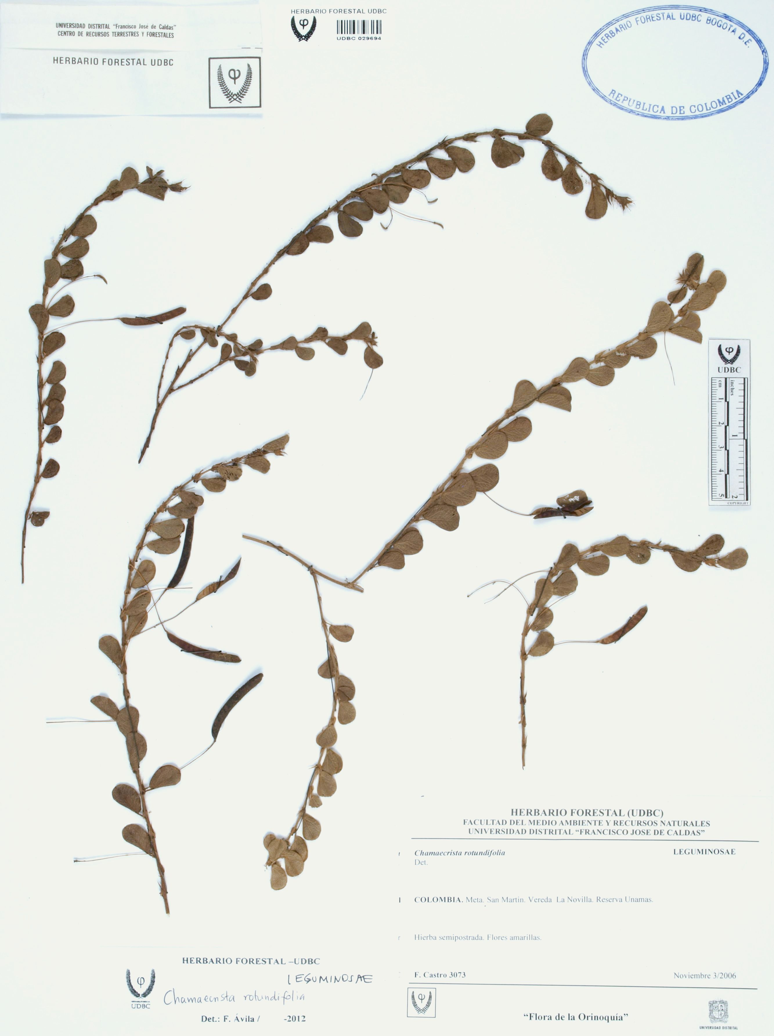 Fotografía del ejemplar Castro, F. 3073, determinado como Chamaecrista rotundifolia en el año 2012