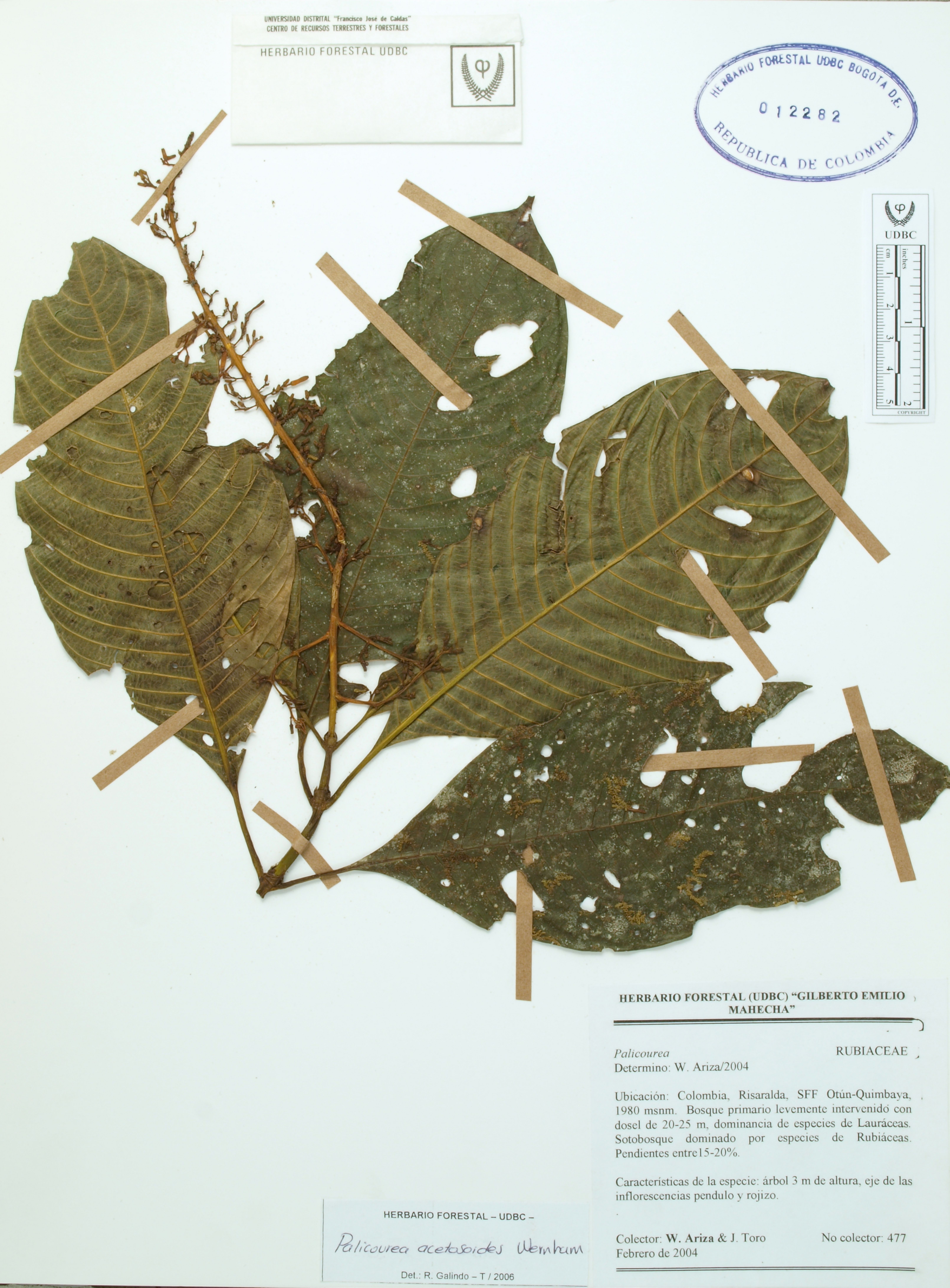 Fotografía del ejemplar Ariza, W. 477, determinado como Palicourea acetosoides en el año 2006