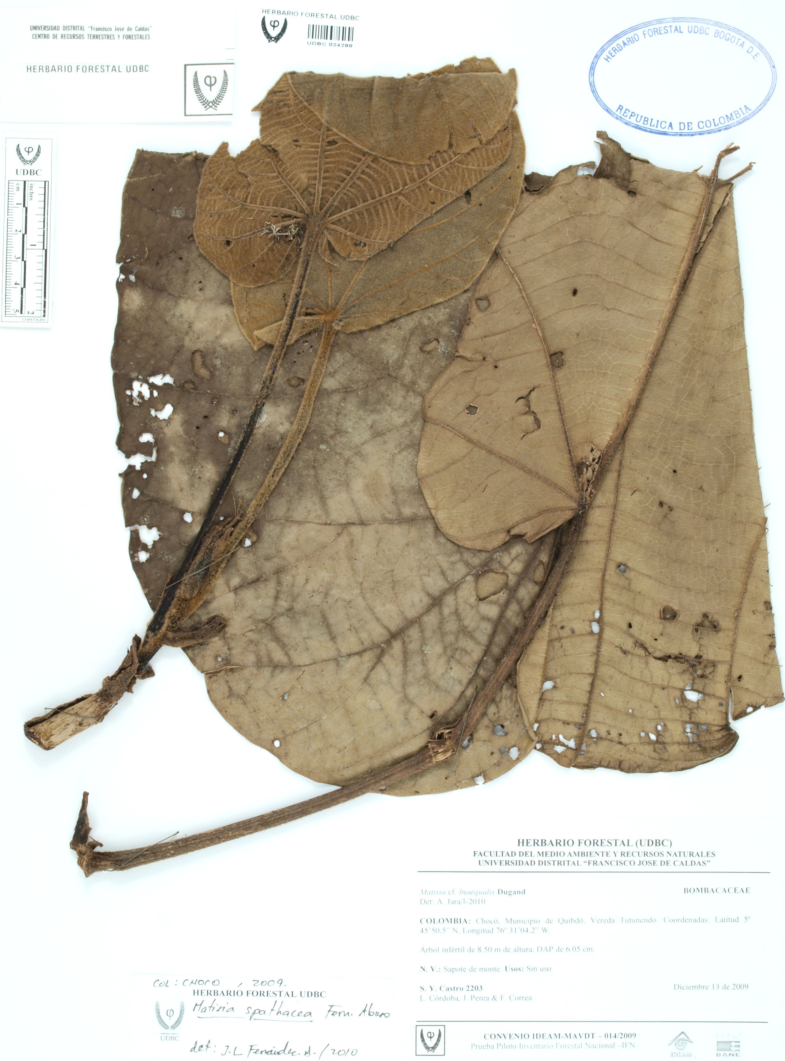 Fotografía del ejemplar Castro, S. 2203, determinado como Matisia spathacea en el año 2010