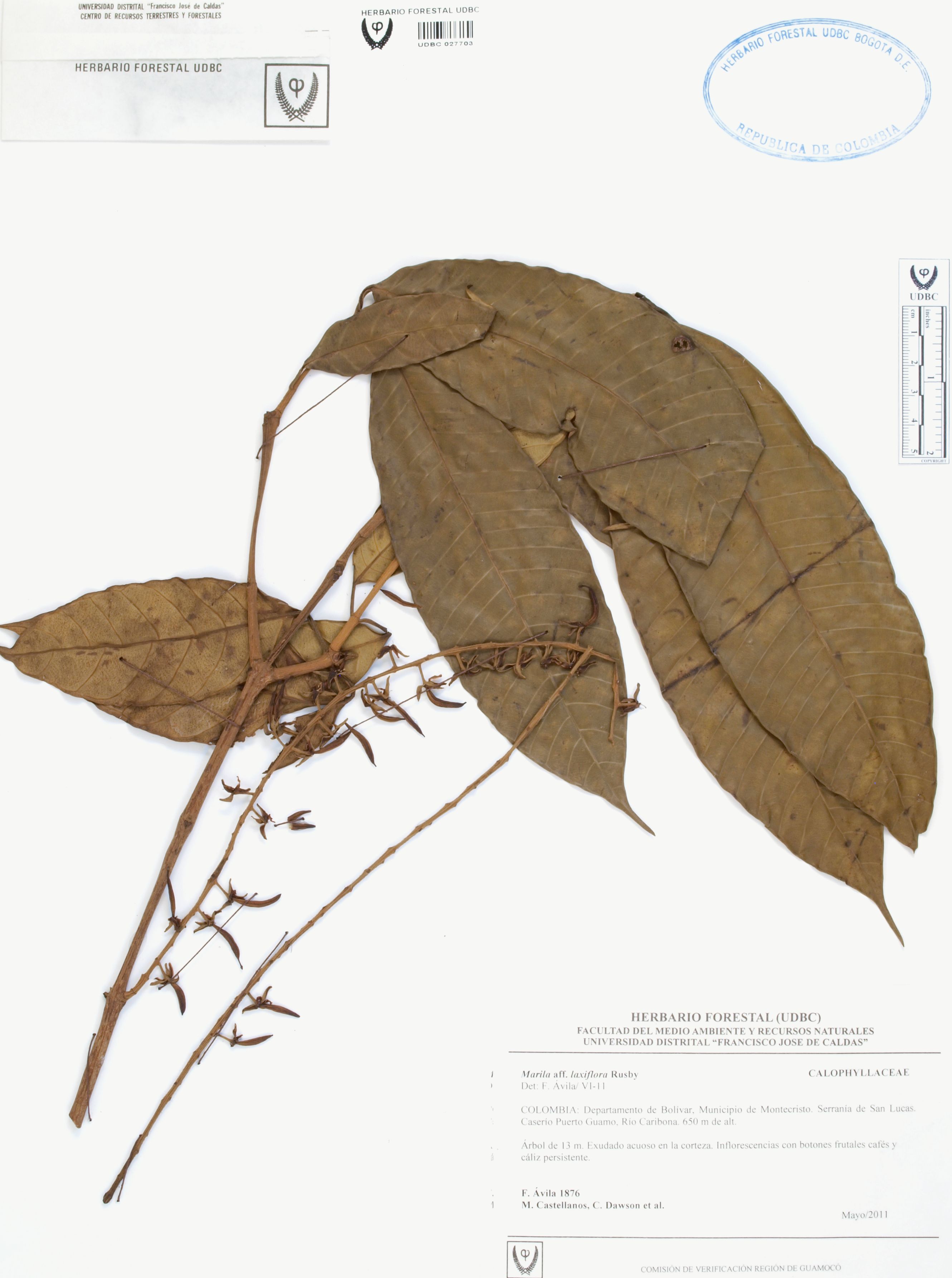 Fotografía del ejemplar Ávila, F. 1876, determinado como Marila laxiflora en el año 2011