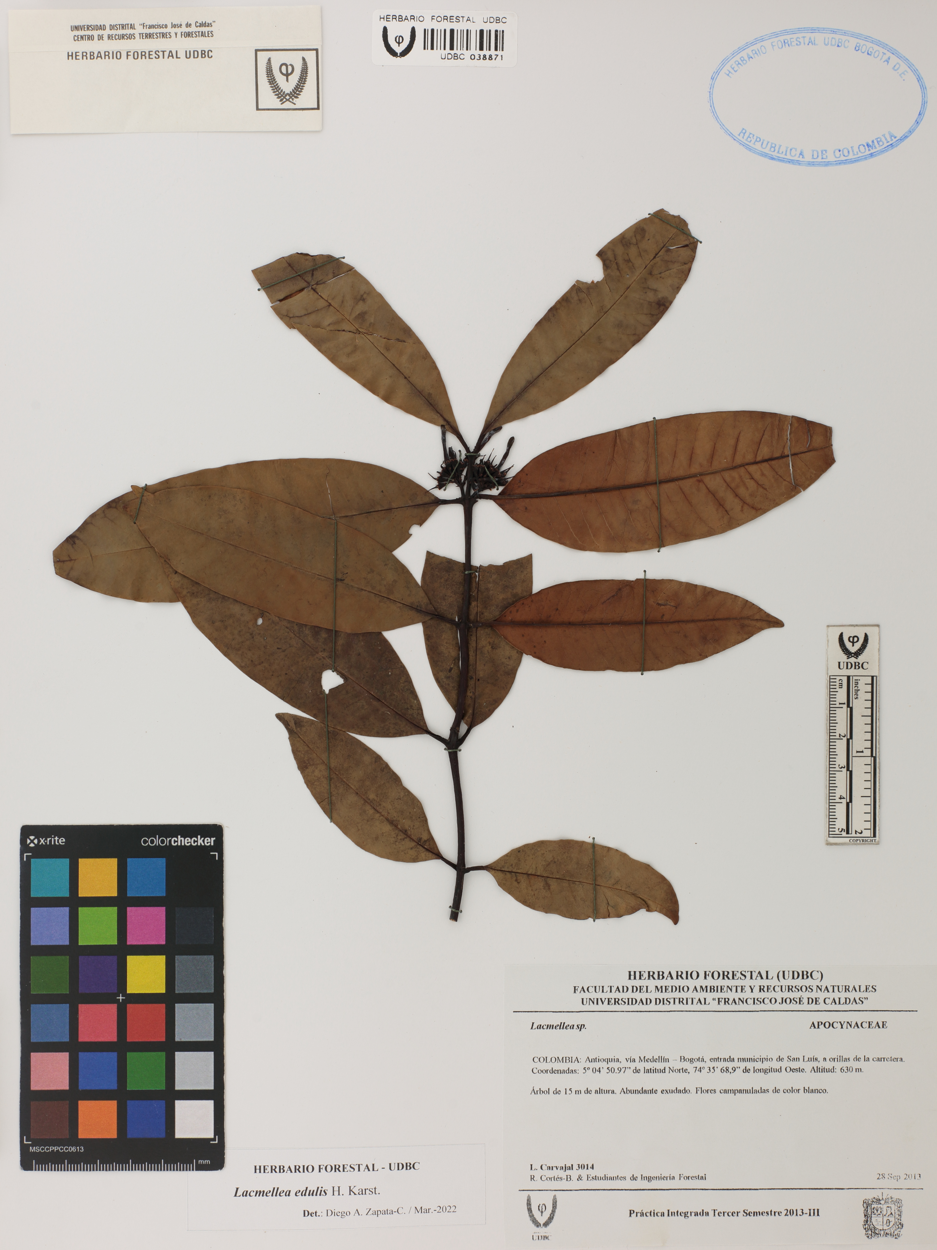 Fotografía del ejemplar Carvajal, L. 3014, determinado como Lacmellea edulis en el año 2022