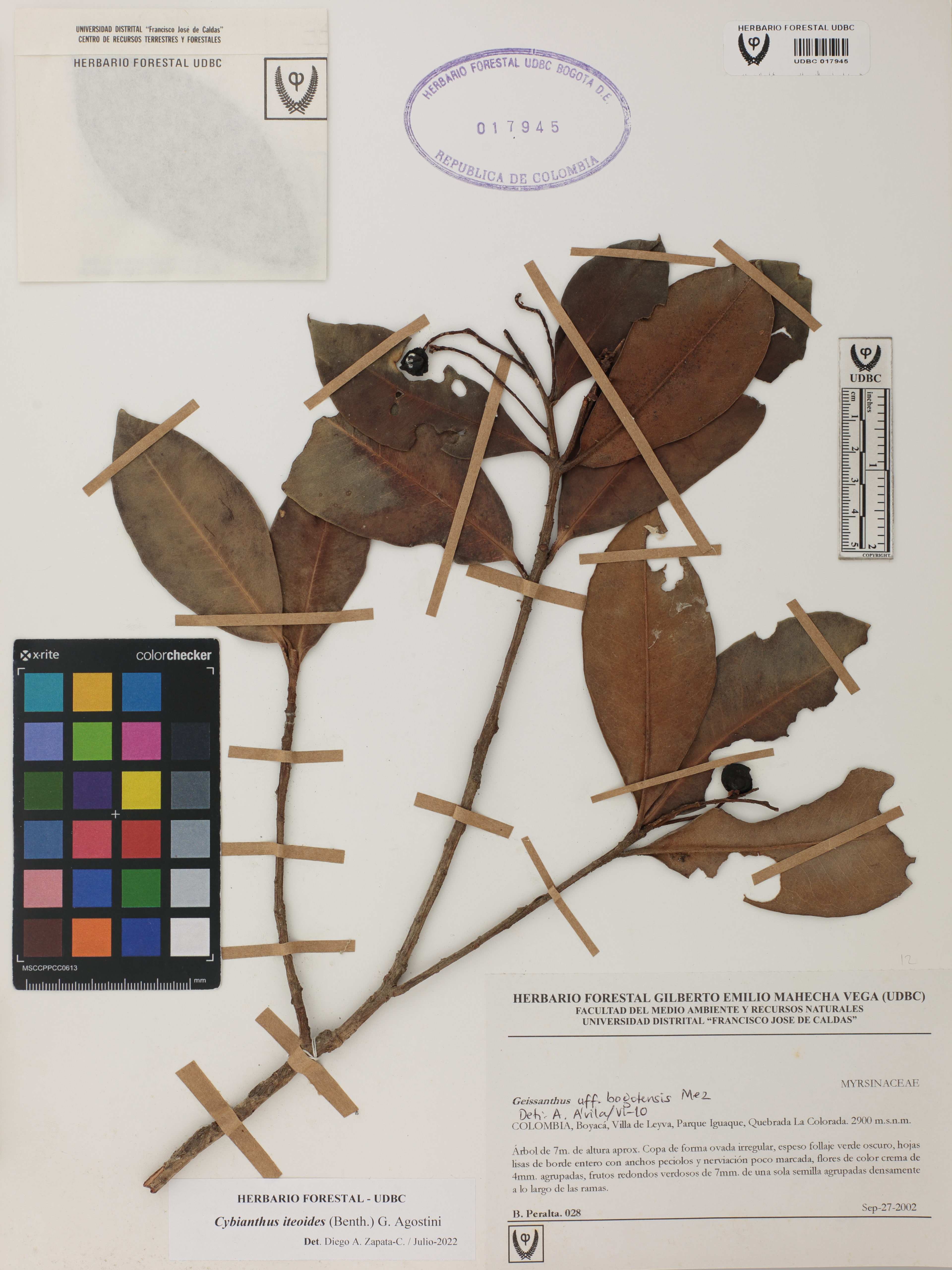 Fotografía del ejemplar Peralta, B. 28, determinado como Cybianthus iteoides en el año 2022