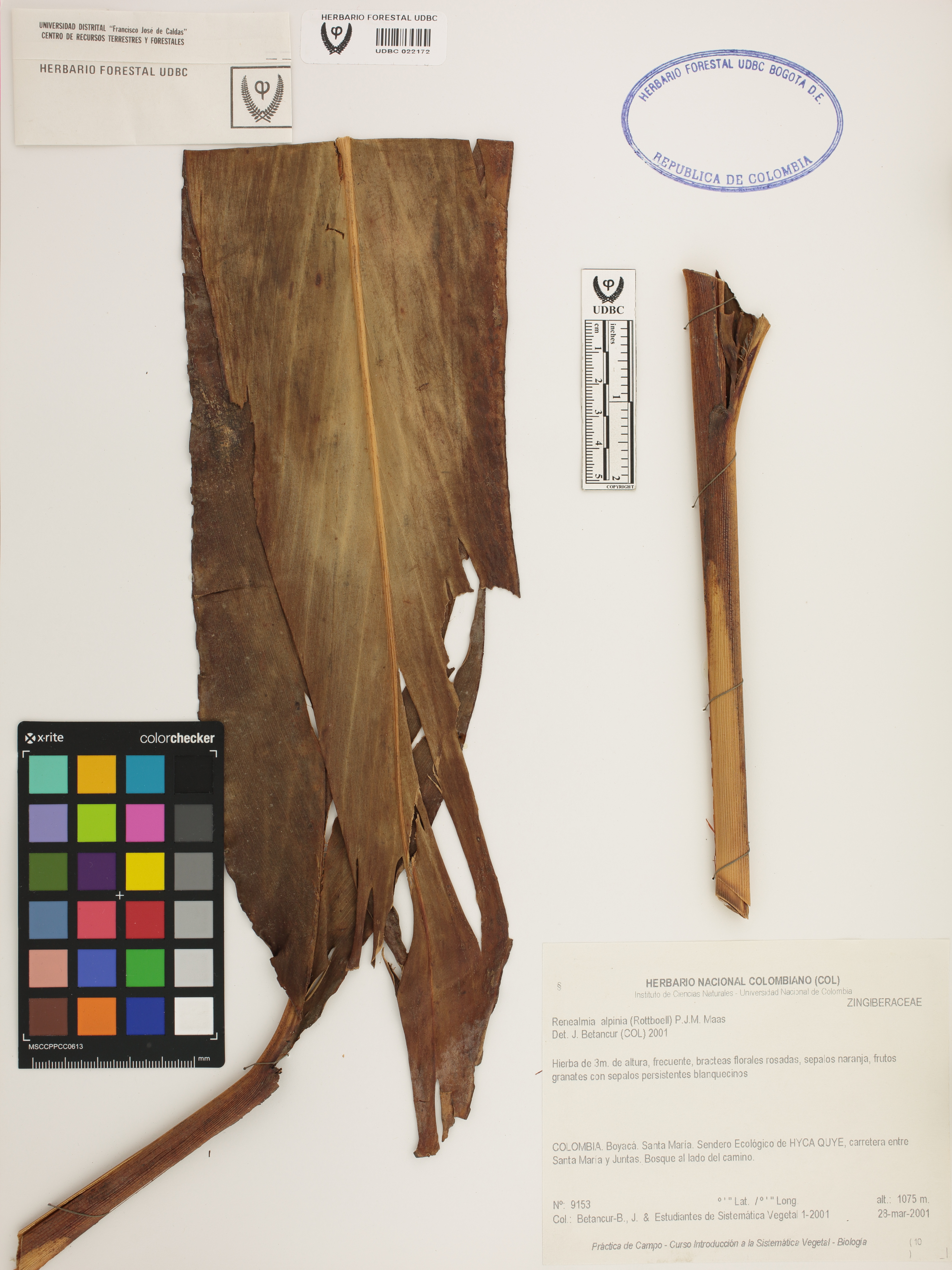 Fotografía del ejemplar Betancurt-B., J. 9153, determinado como Renealmia alpinia en el año 2001