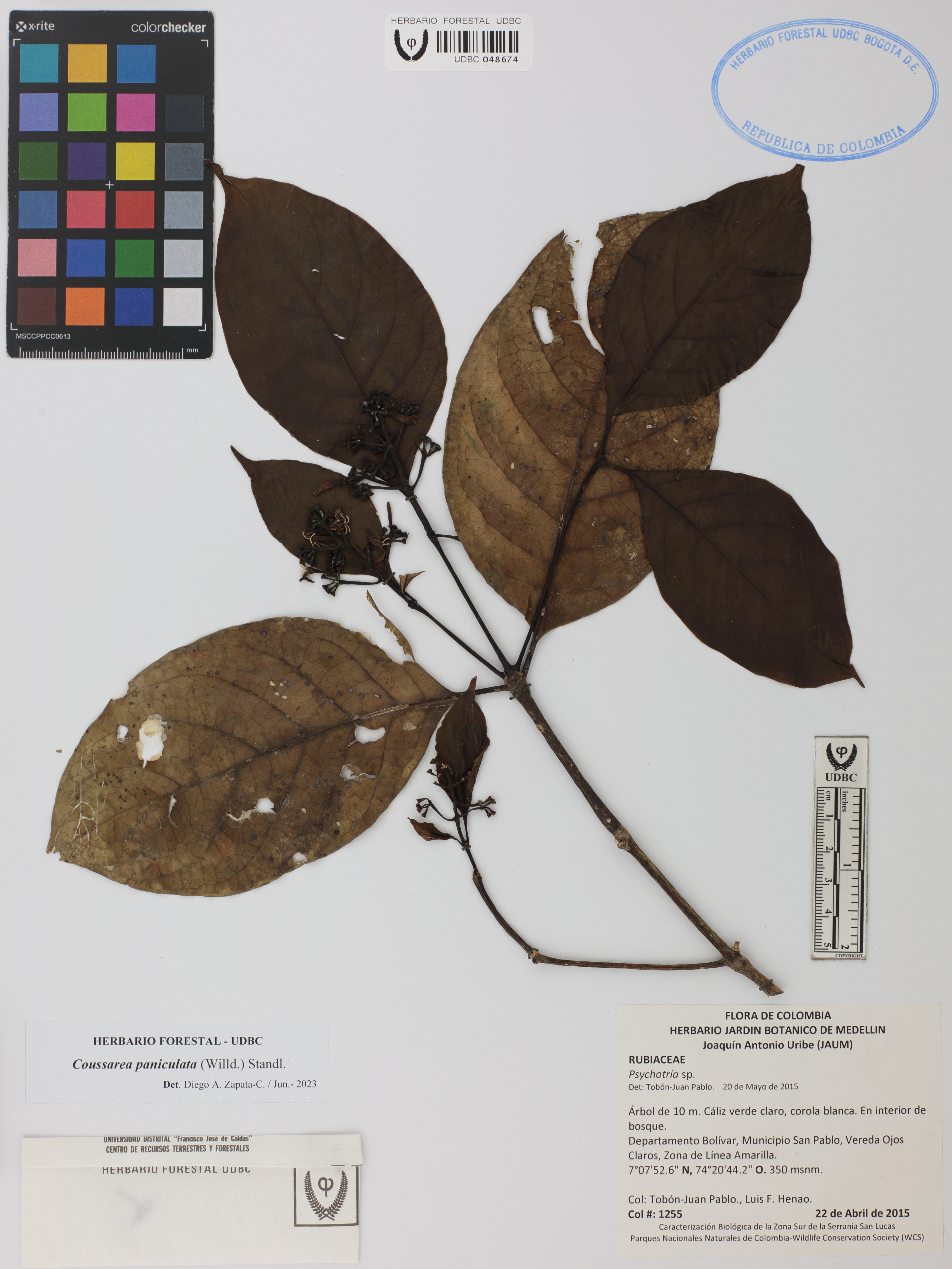 Fotografía del ejemplar Tobón-A., J. 1255, determinado como Coussarea paniculata en el año 2023