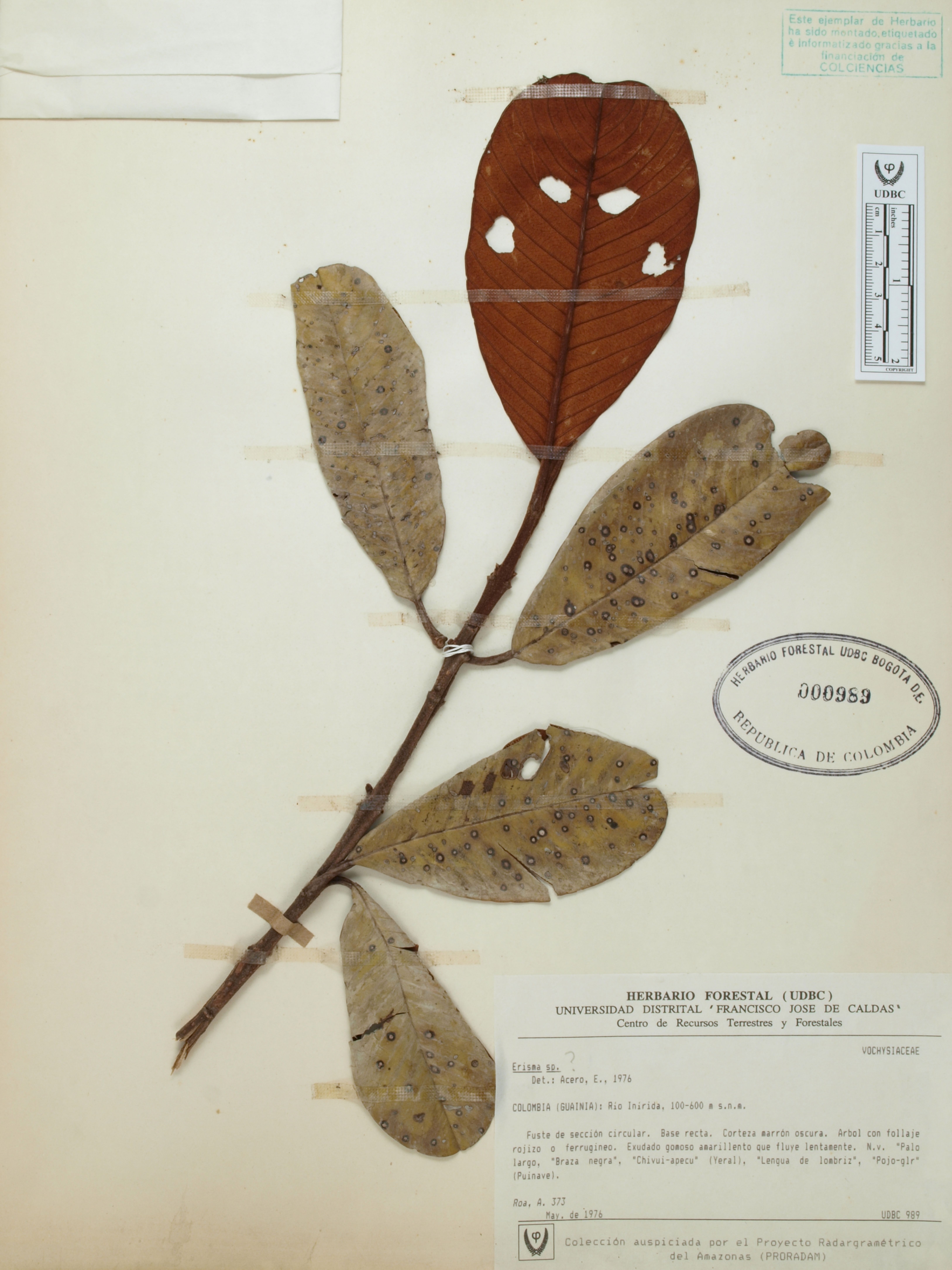Fotografía del ejemplar Roa, A. 373, determinado como Erisma sp. en el año 1976