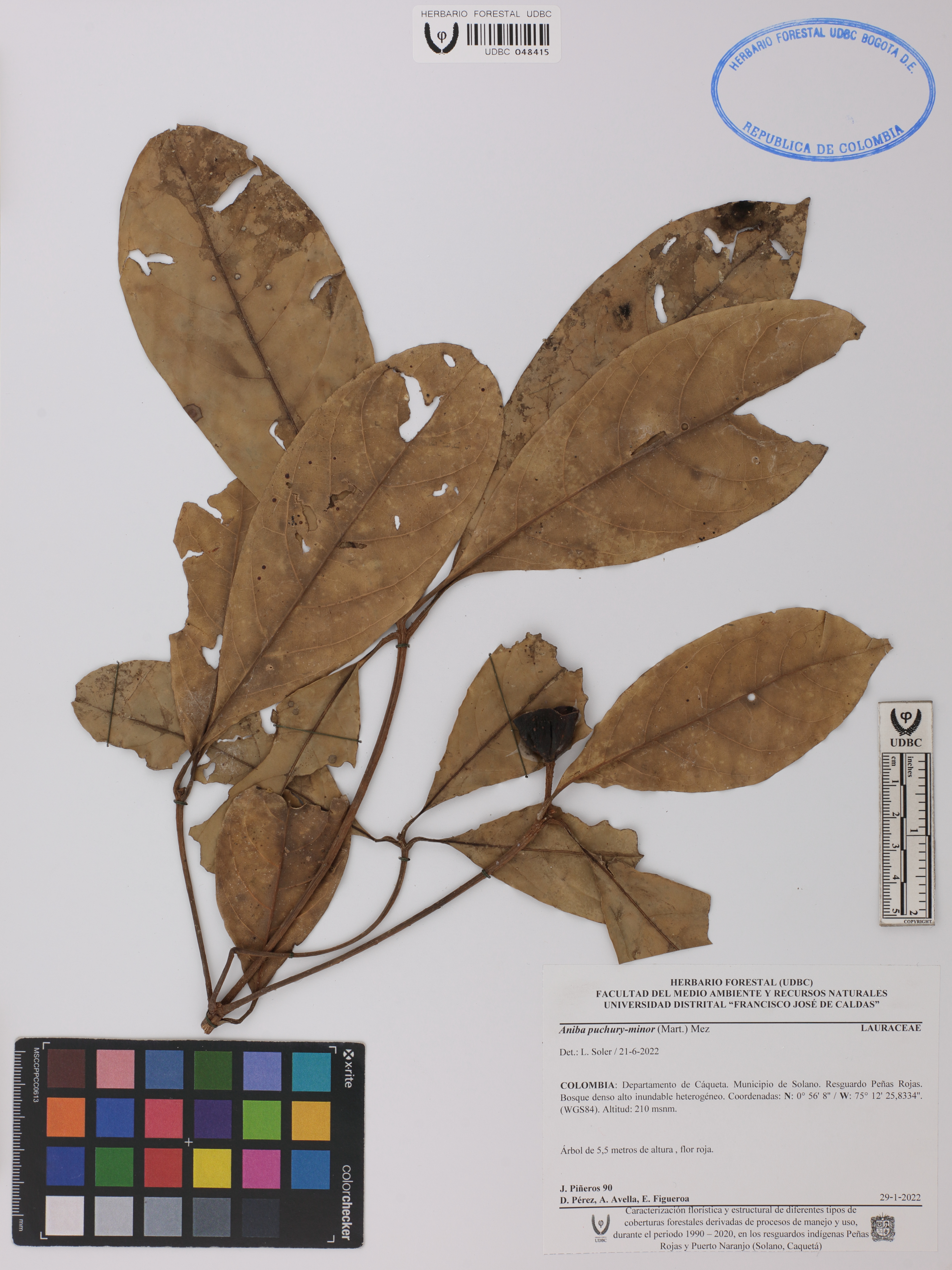 Fotografía del ejemplar Piñeros, J. 90, determinado como Aniba puchury-minor en el año 2022