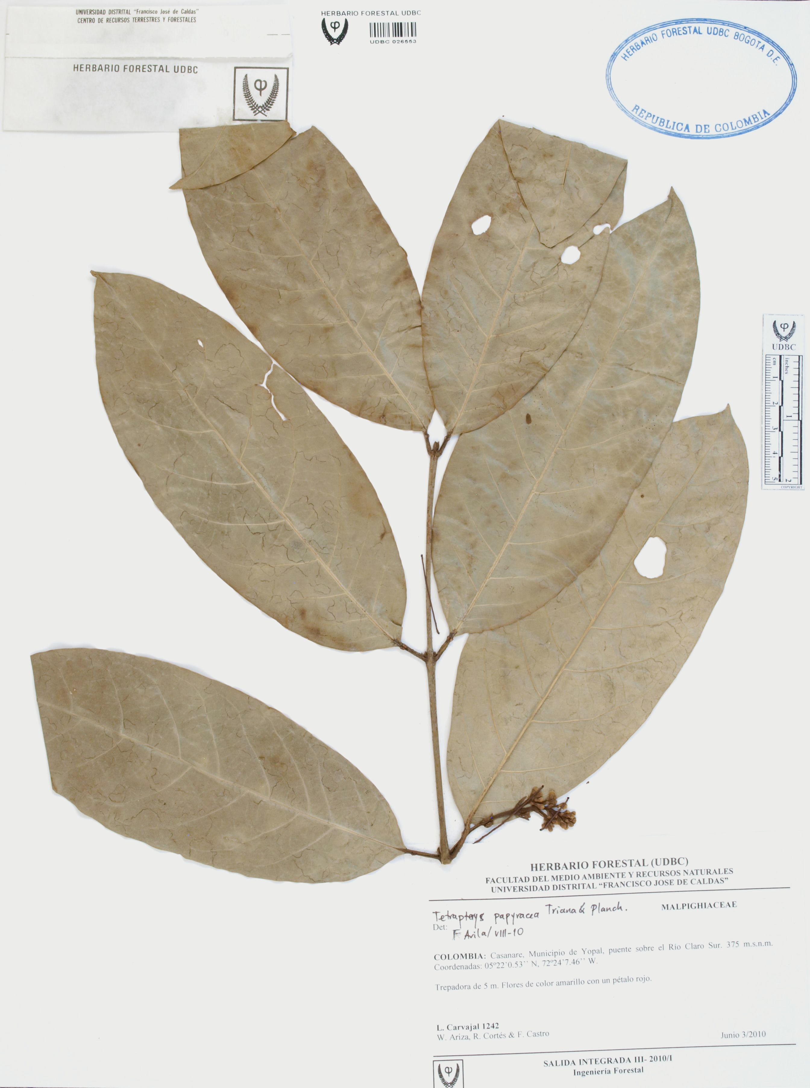 Fotografía del ejemplar Carvajal, L. 1242, determinado como Tetrapterys papyracea en el año 2010