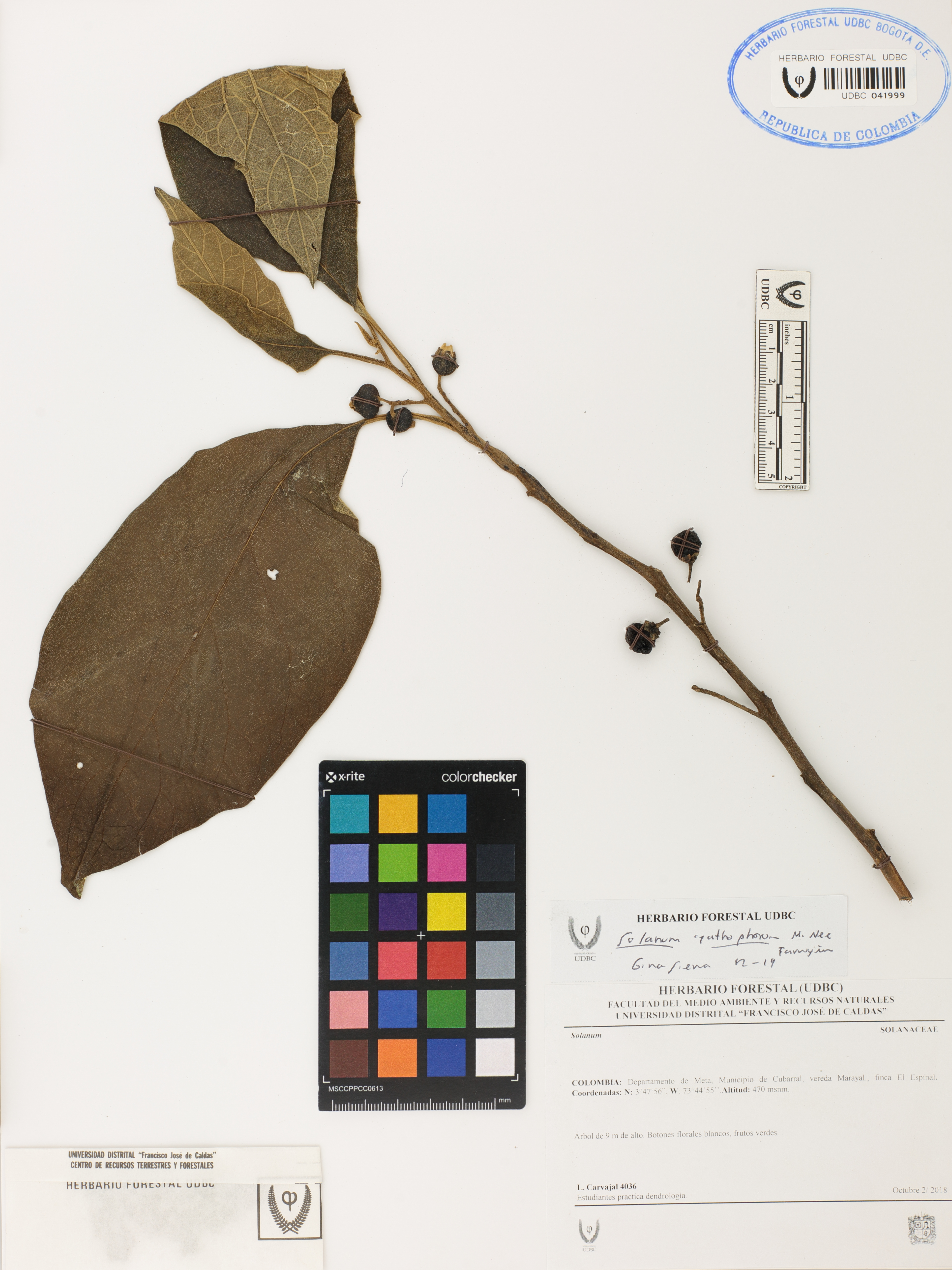 Fotografía del ejemplar Carvajal, L. 4036, determinado como Solanum cyathophorum en el año 2019