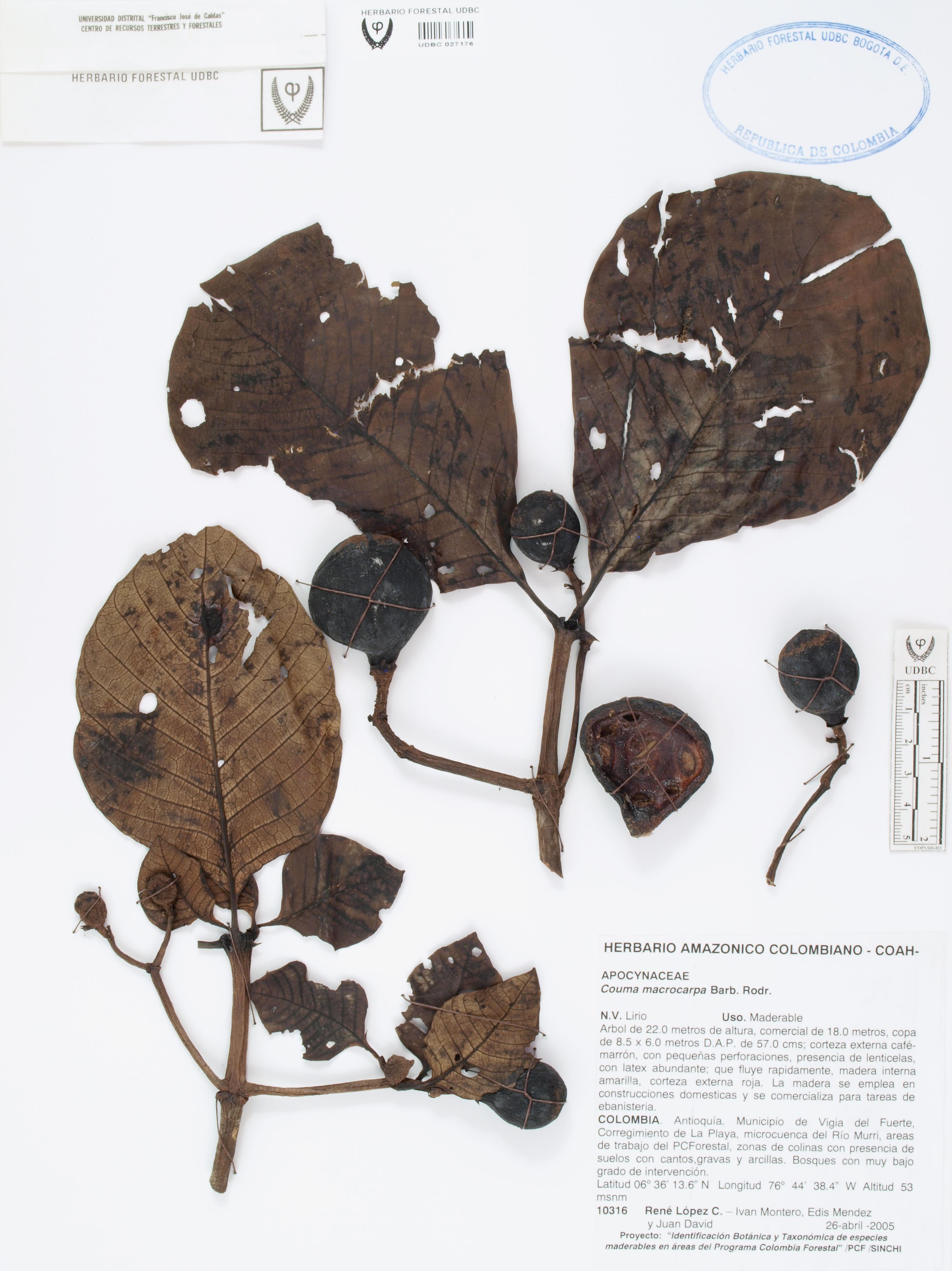 Fotografía del ejemplar López, R. 10316, determinado como Couma macrocarpa