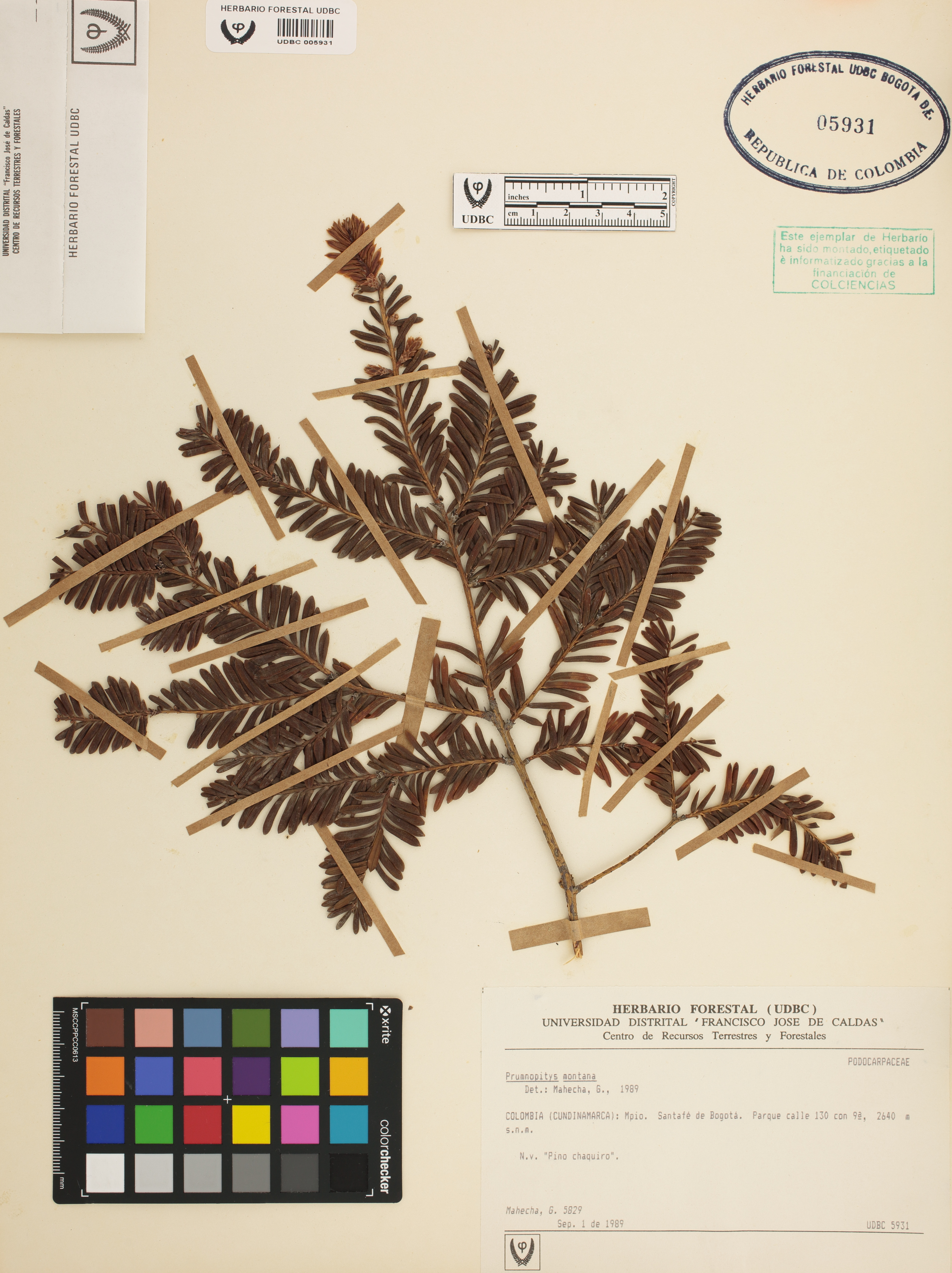 Fotografía del ejemplar Mahecha, G. 5829, determinado como Prumnopitys montana en el año 1989