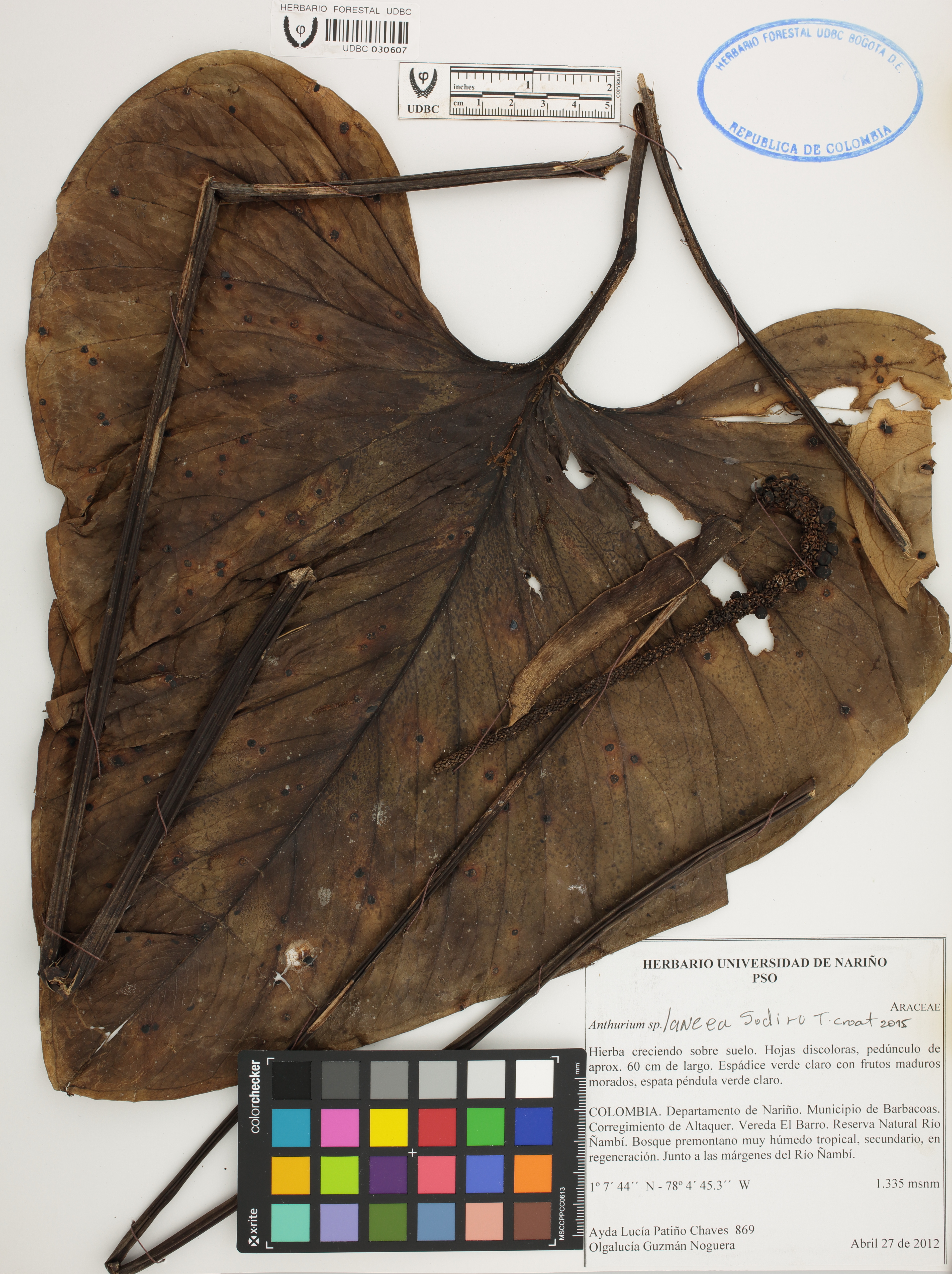 Fotografía del ejemplar Patiño, A. 869, determinado como Anthurium lancea en el año 2015