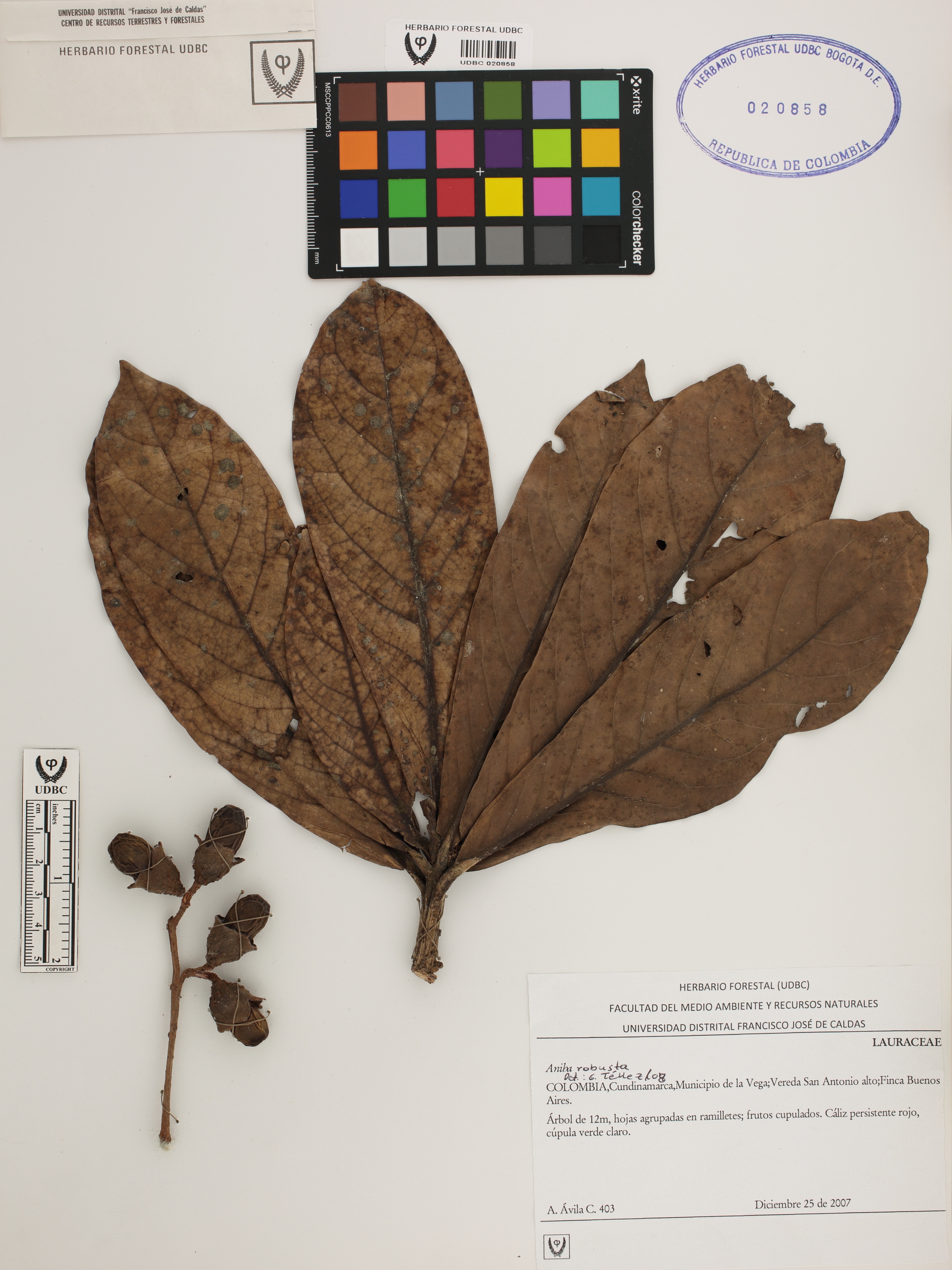 Fotografía del ejemplar Ávila-C., A. 403, determinado como Aniba robusta en el año 2008