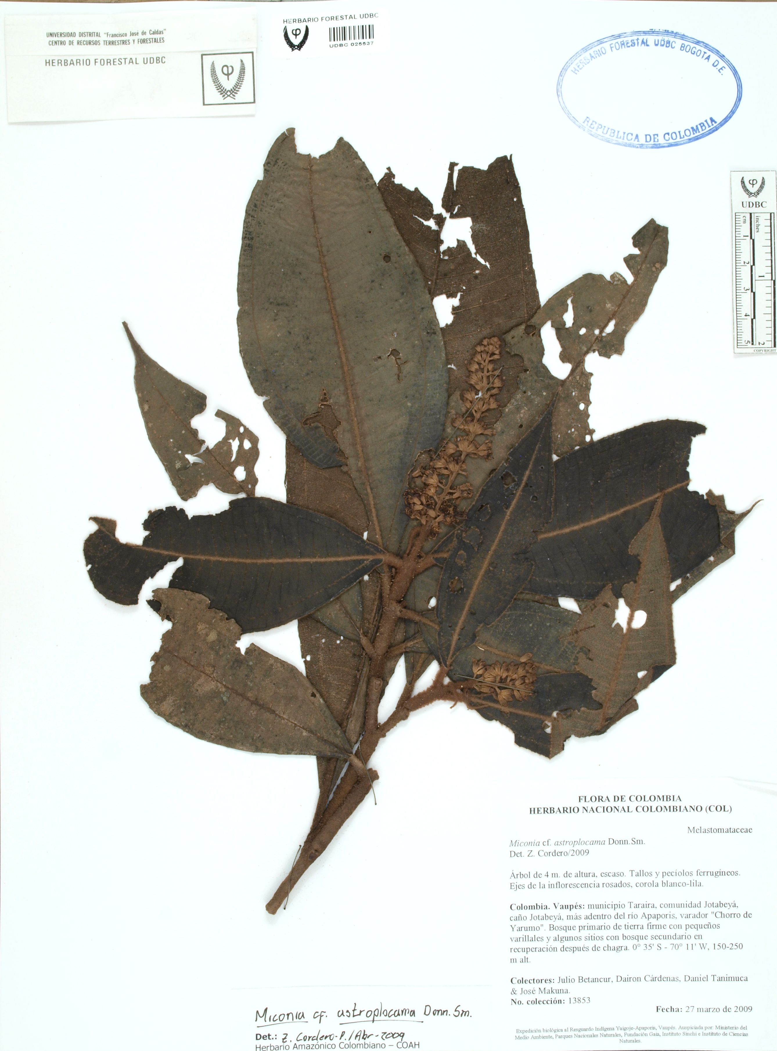 Fotografía del ejemplar Betancur, J. 13853, determinado como Miconia astroplocama en el año 2009