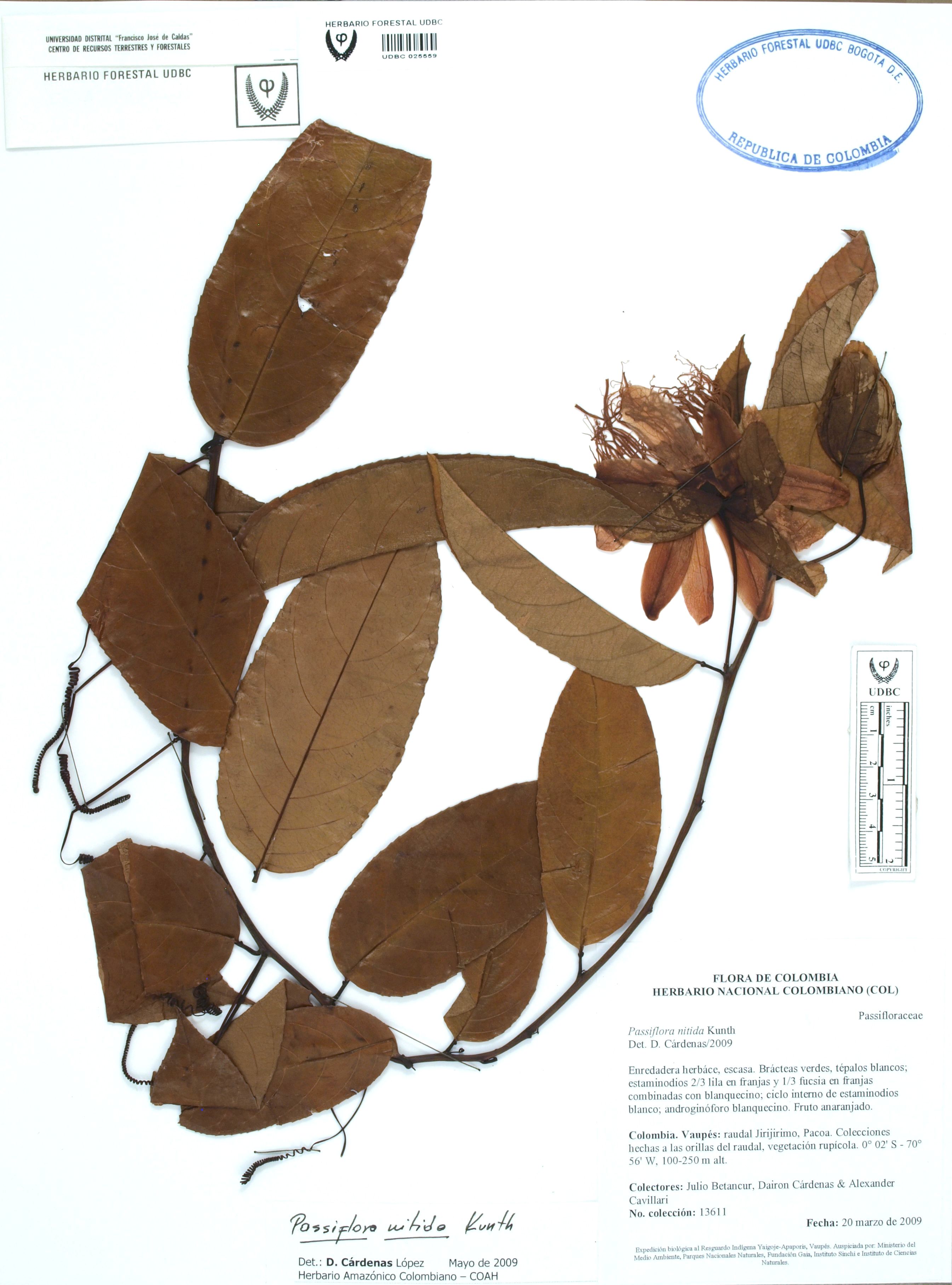 Fotografía del ejemplar Betancur, J. 13611, determinado como Passiflora nitida en el año 2009