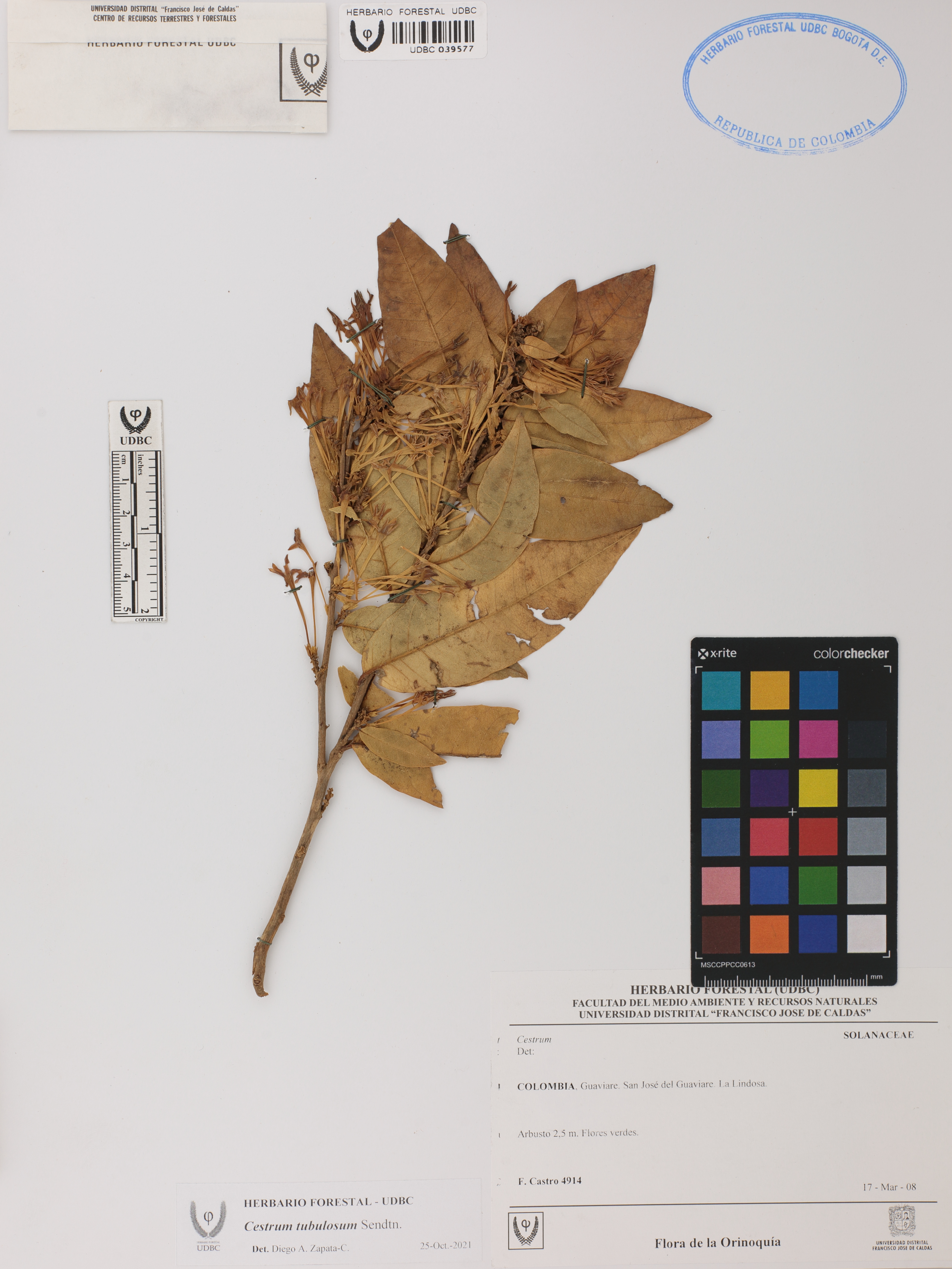 Fotografía del ejemplar Castro, F. 4914, determinado como Cestrum tubulosum en el año 2021