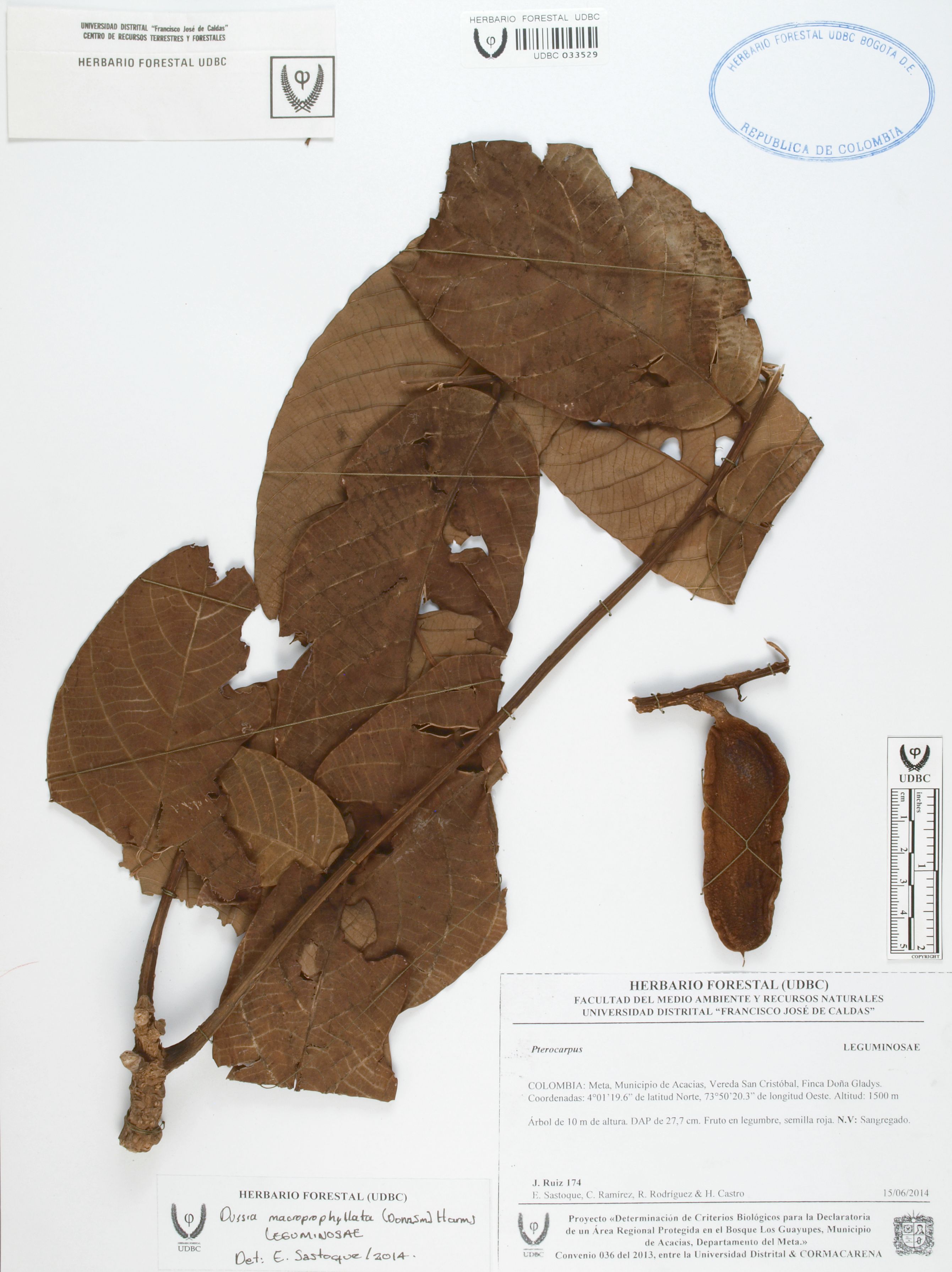 Fotografía del ejemplar Ruiz, J. 174, determinado como Dussia macroprophyllata en el año 2014