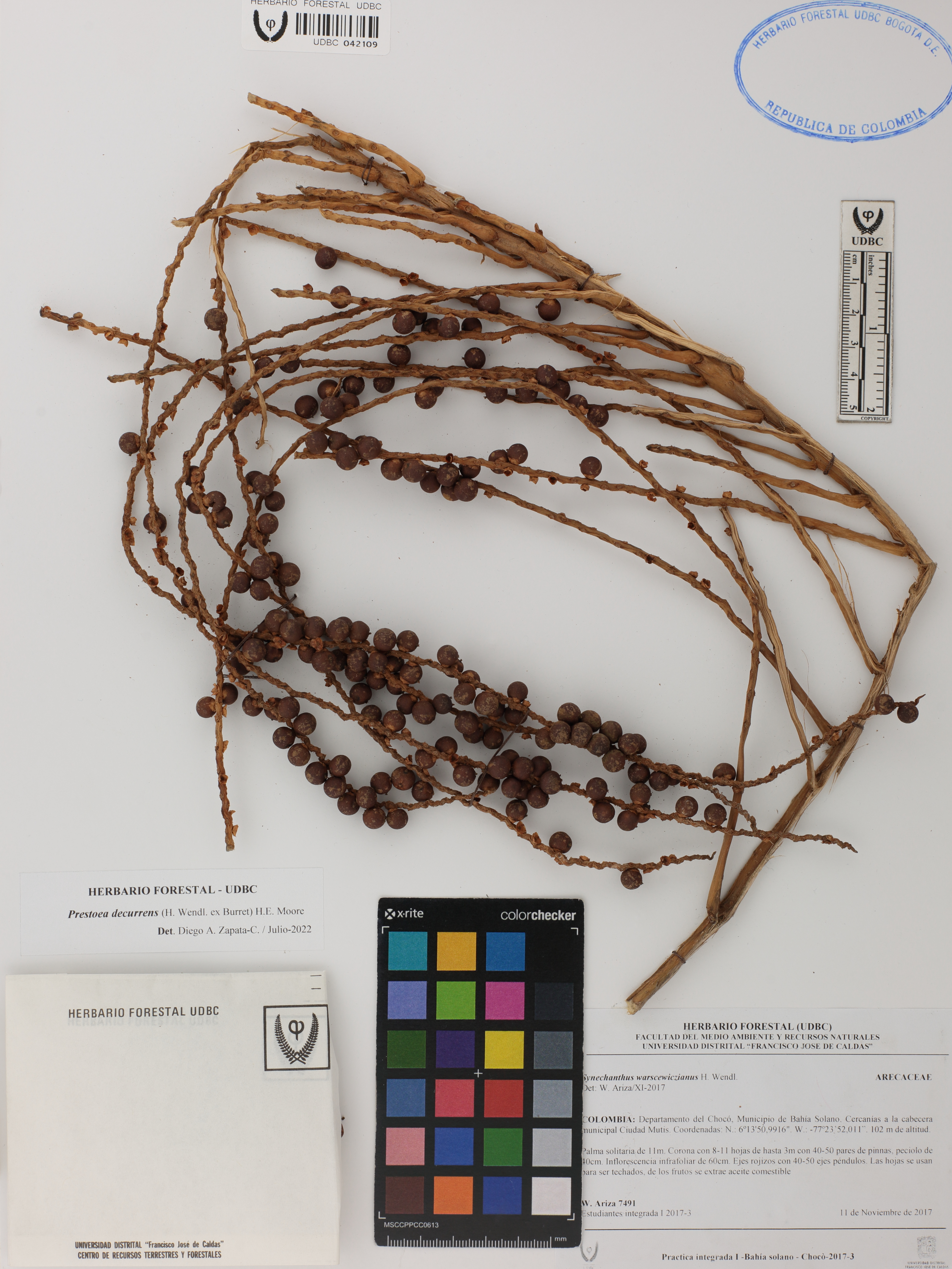 Fotografía del ejemplar Ariza, W. 7491, determinado como Prestoea decurrens en el año 2022