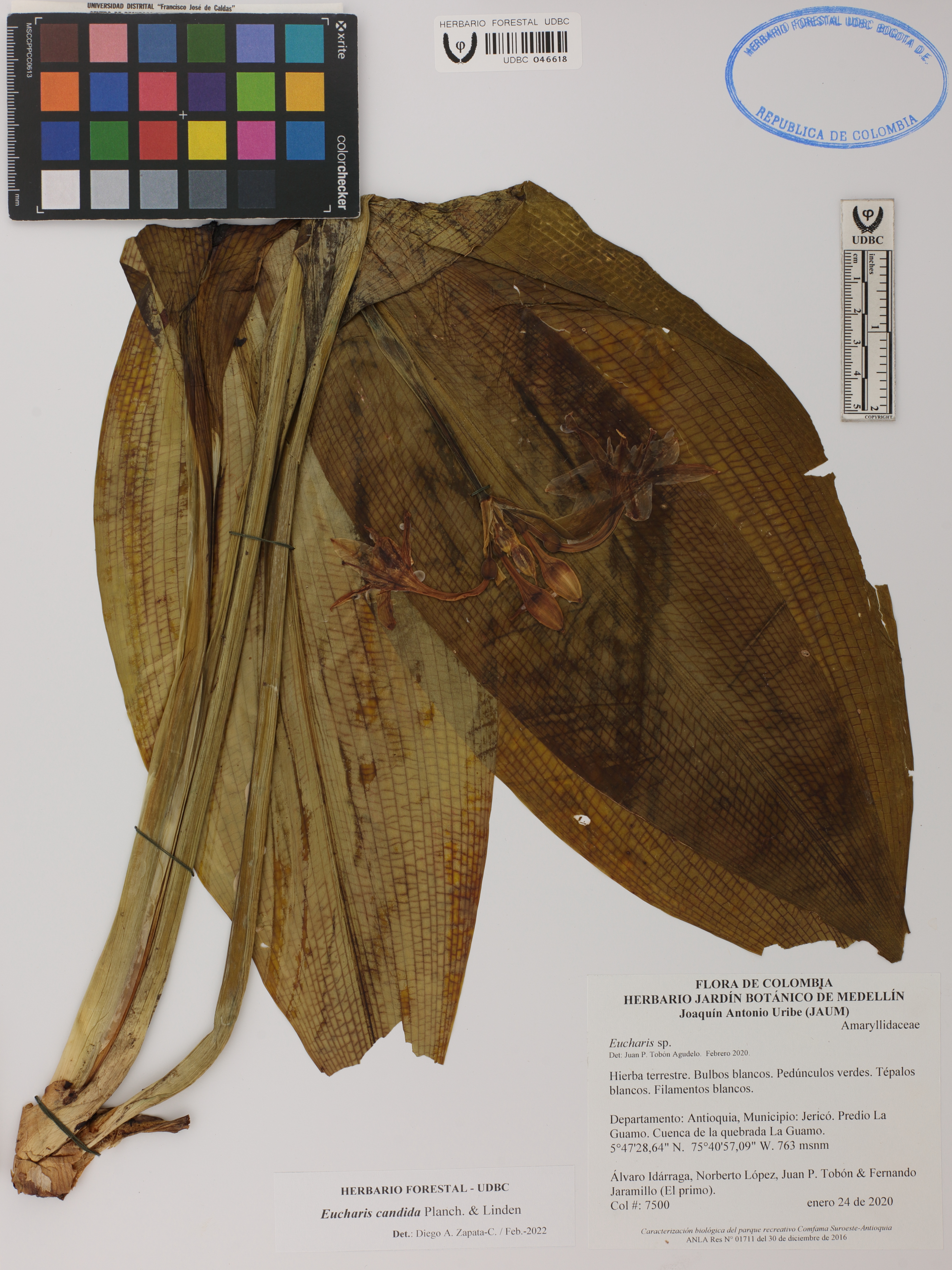 Fotografía del ejemplar Idárraga, Á. 7500, determinado como Eucharis candida en el año 2022