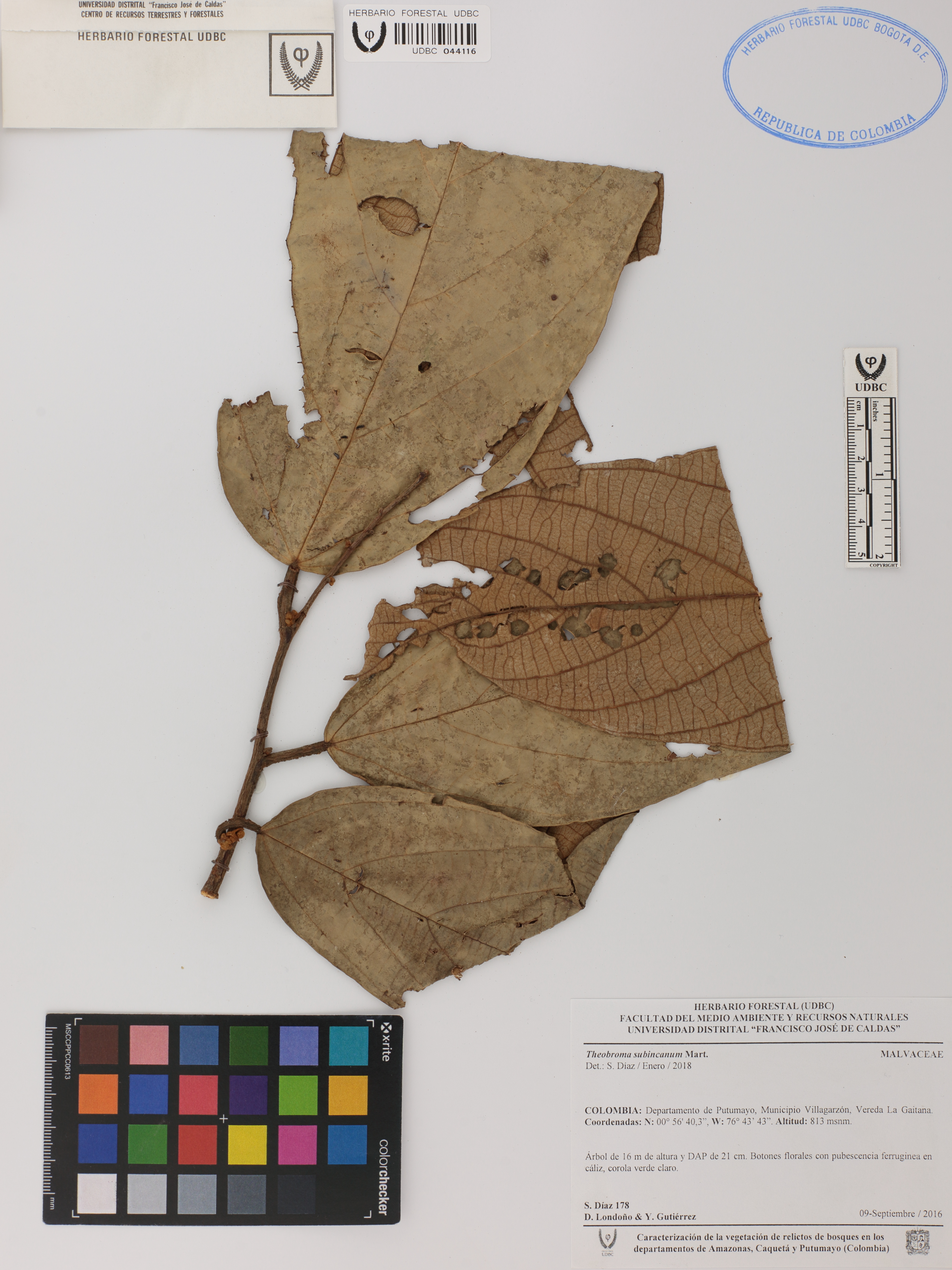 Fotografía del ejemplar Díaz, S. 178, determinado como Theobroma subincanum en el año 2018