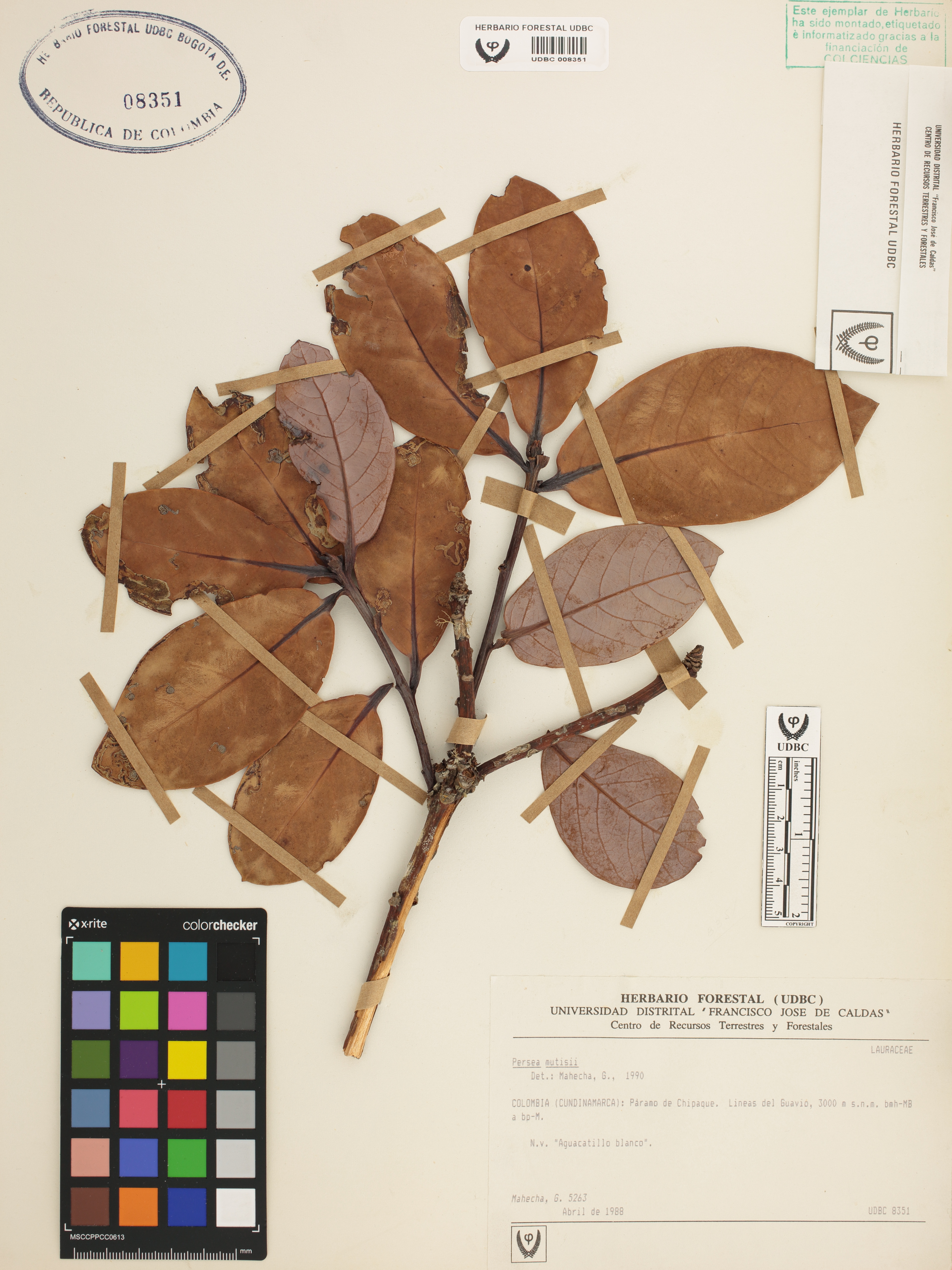 Fotografía del ejemplar Mahecha, G. 5263, determinado como Persea mutisii en el año 1990