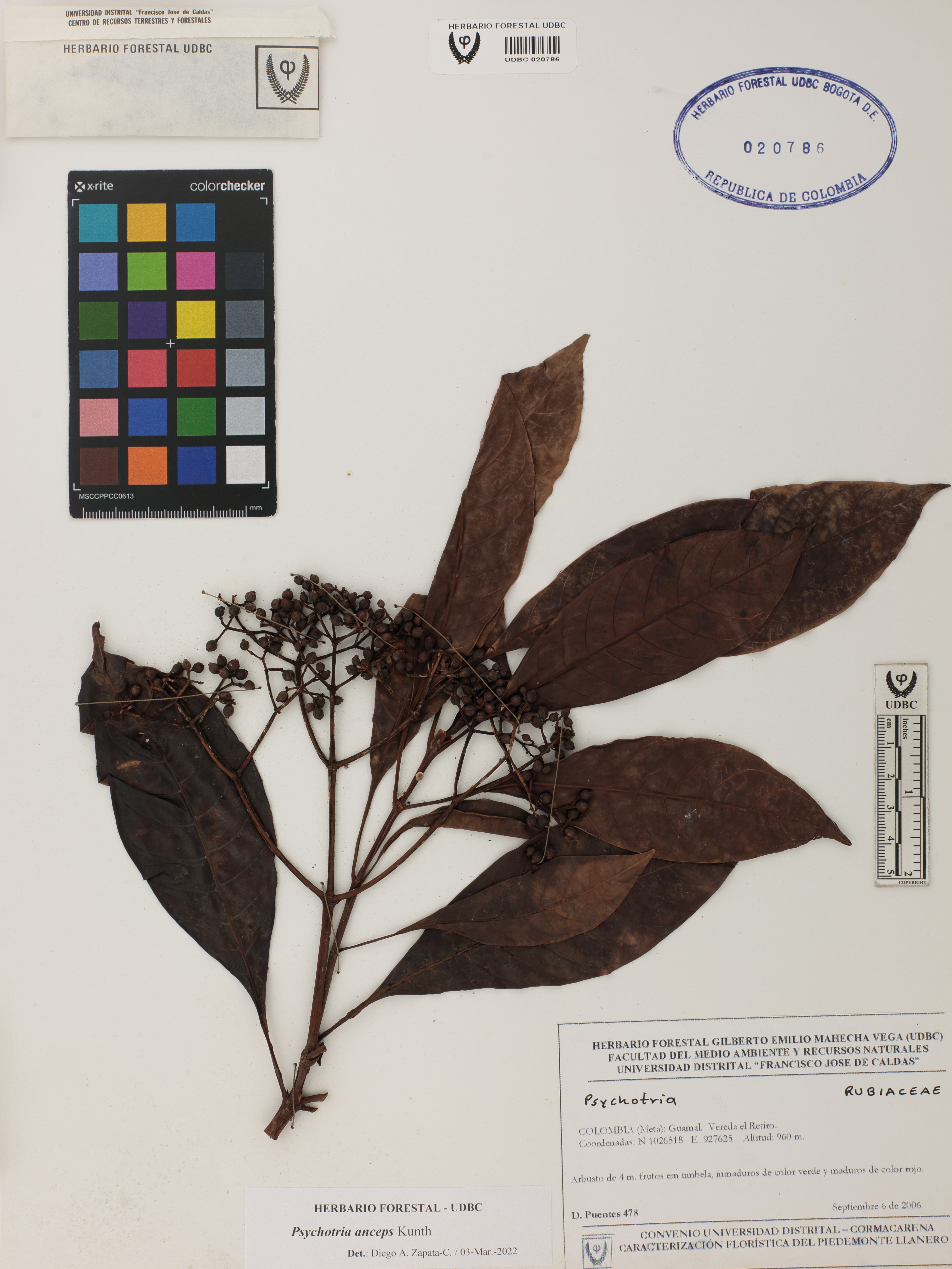 Fotografía del ejemplar Puentes, D. 478, determinado como Psychotria anceps en el año 2022
