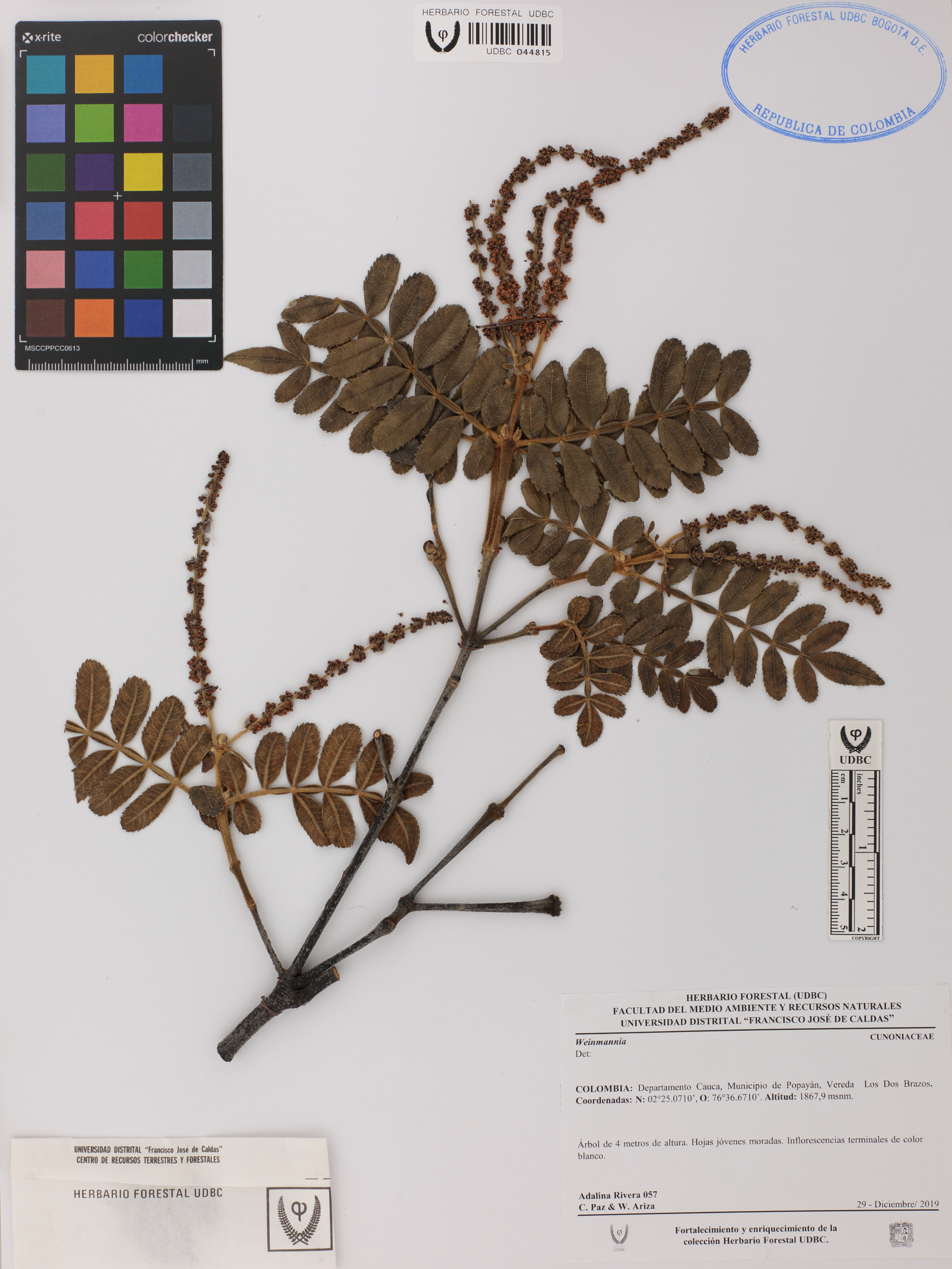 Fotografía del ejemplar Rivera, A. 57, determinado como Weinmannia pubescens en el año 2024