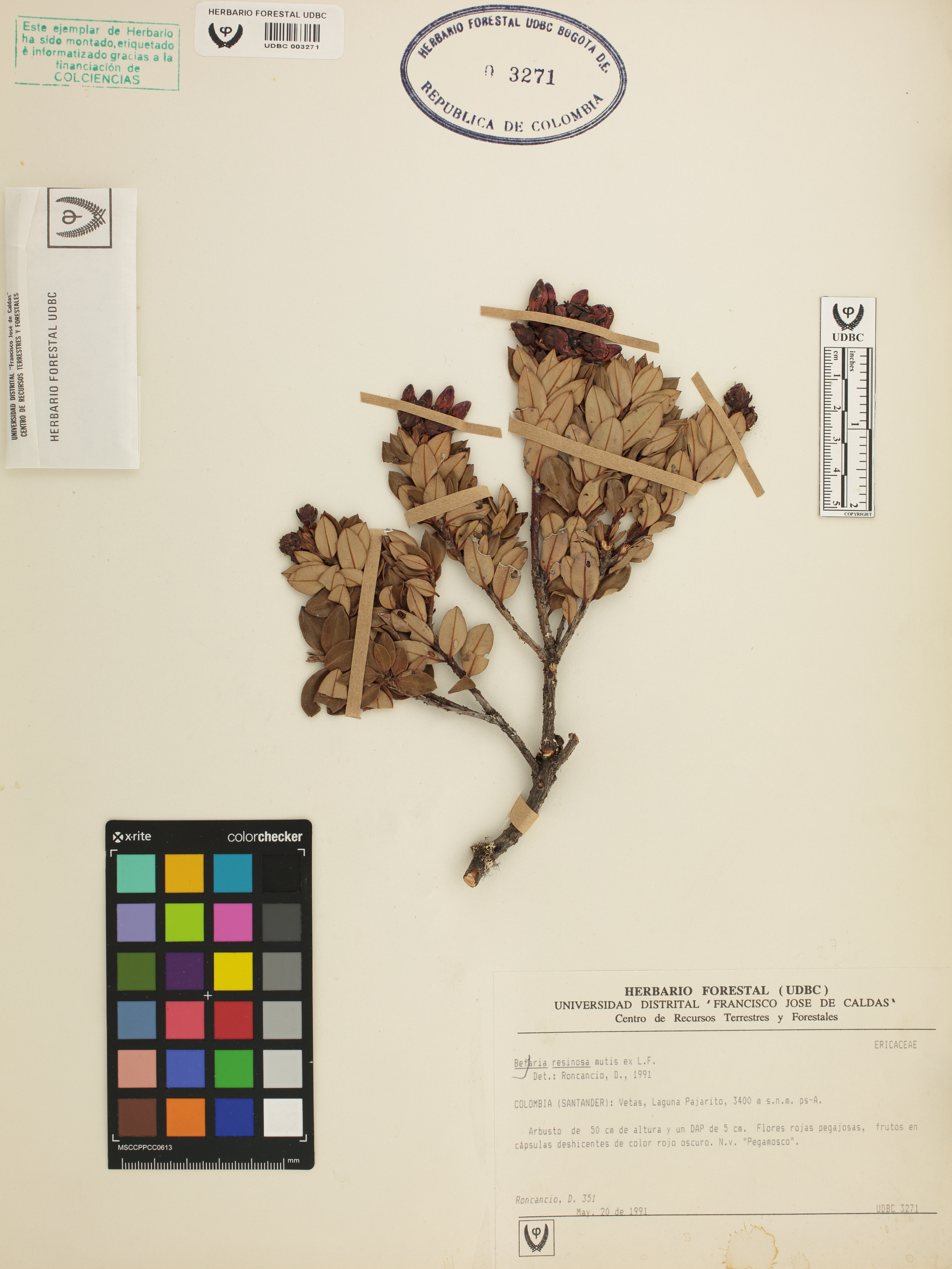 Fotografía del ejemplar Roncancio, D. 351, determinado como Bejaria resinosa en el año 1991