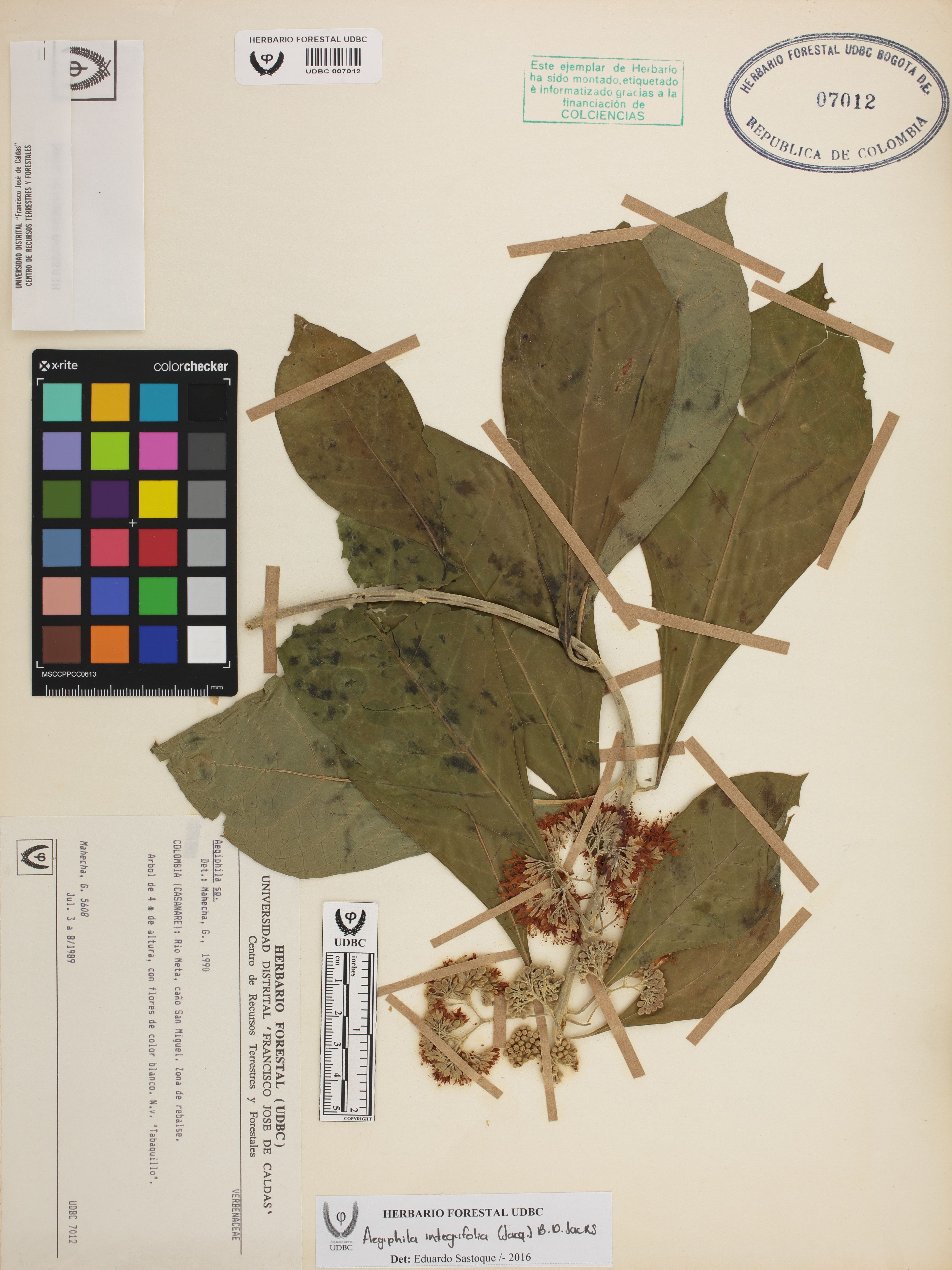 Fotografía del ejemplar Mahecha, G. 5608, determinado como Aegiphila integrifolia en el año 2016