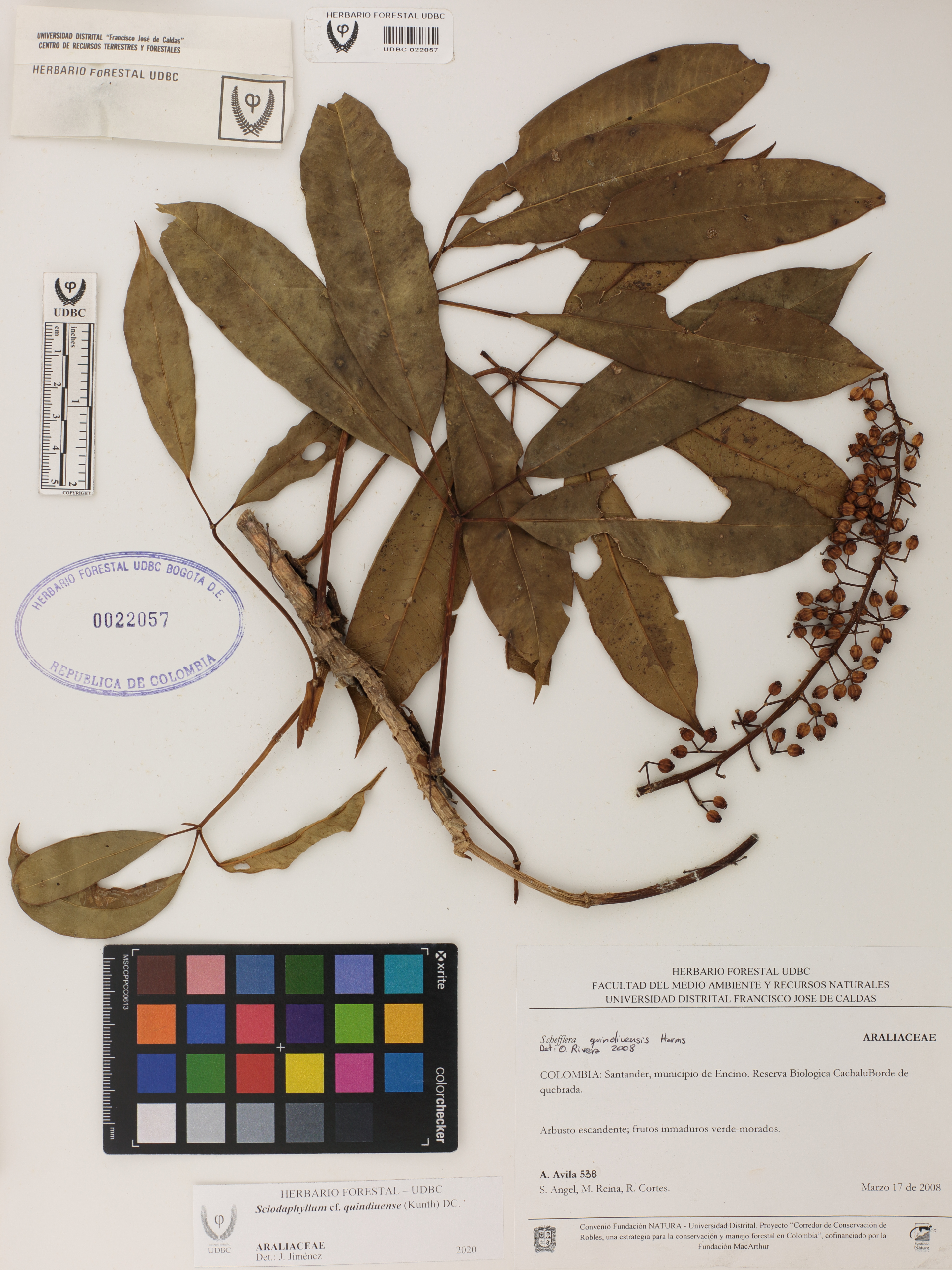 Fotografía del ejemplar Ávila, A. 538, determinado como Sciodaphyllum quindiuense en el año 2020