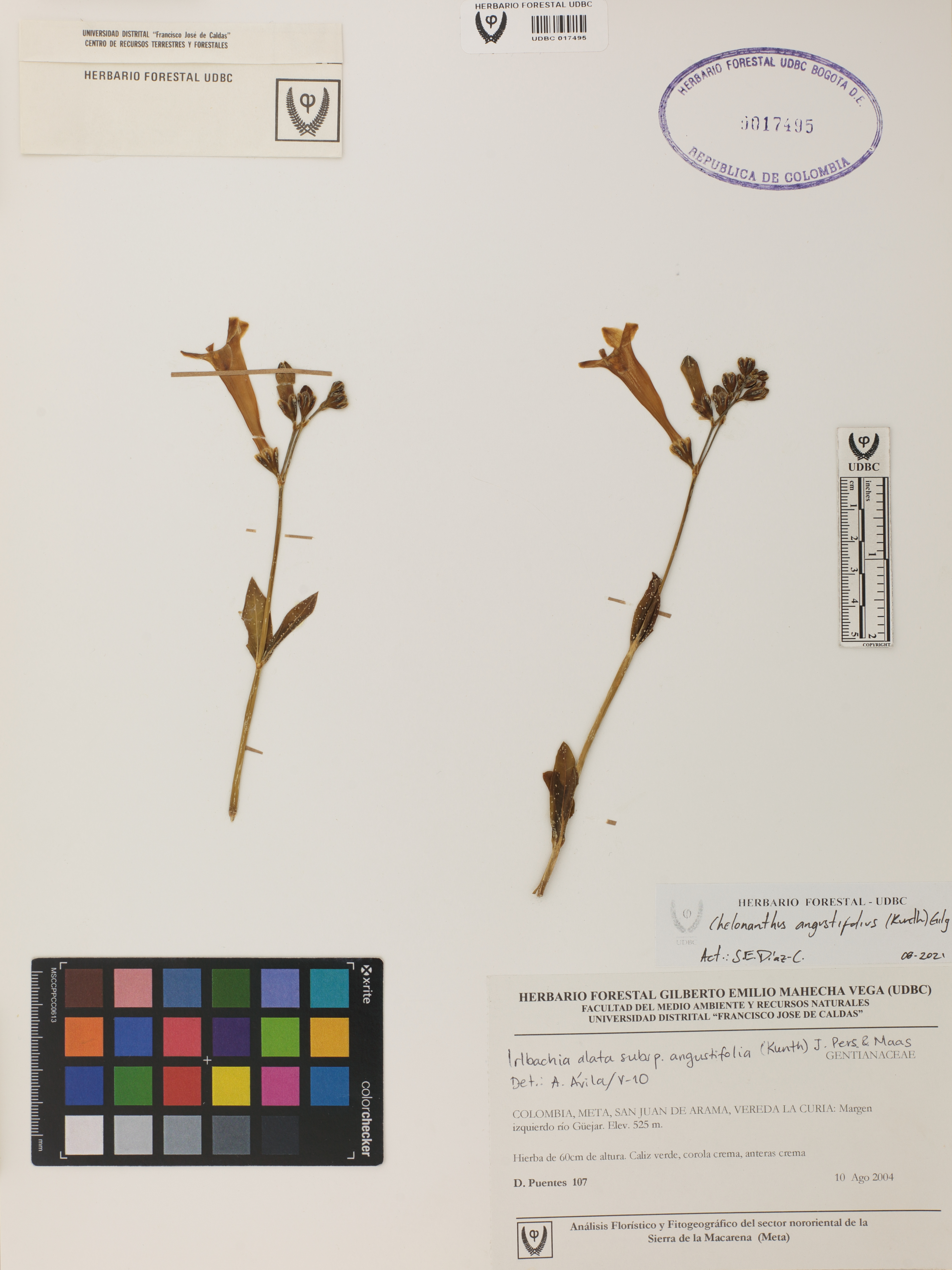 Fotografía del ejemplar Puentes, D. 107, determinado como Chelonanthus angustifolius en el año 2010