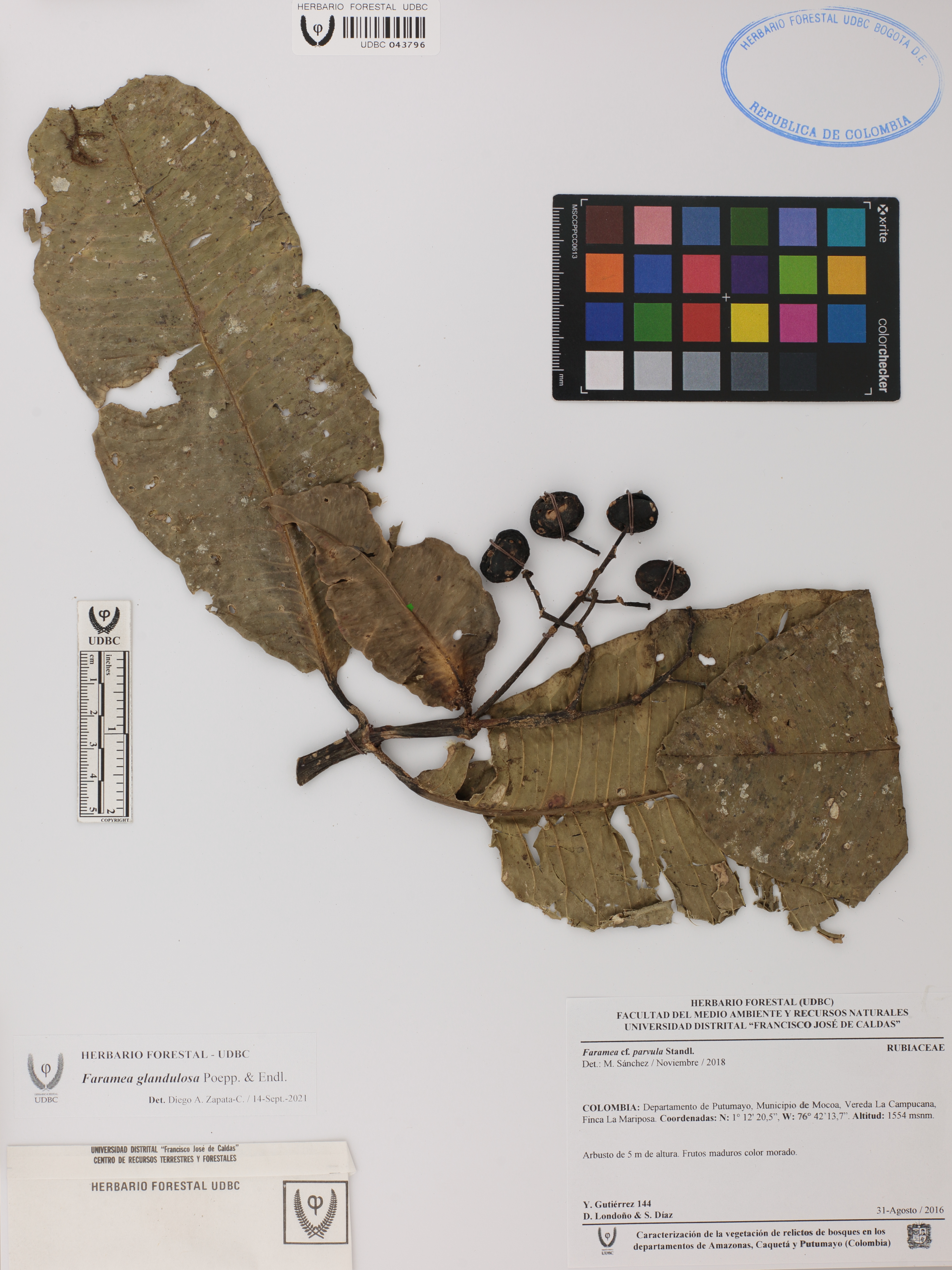 Fotografía del ejemplar Gutiérrez, Y. 144, determinado como Faramea glandulosa en el año 2021